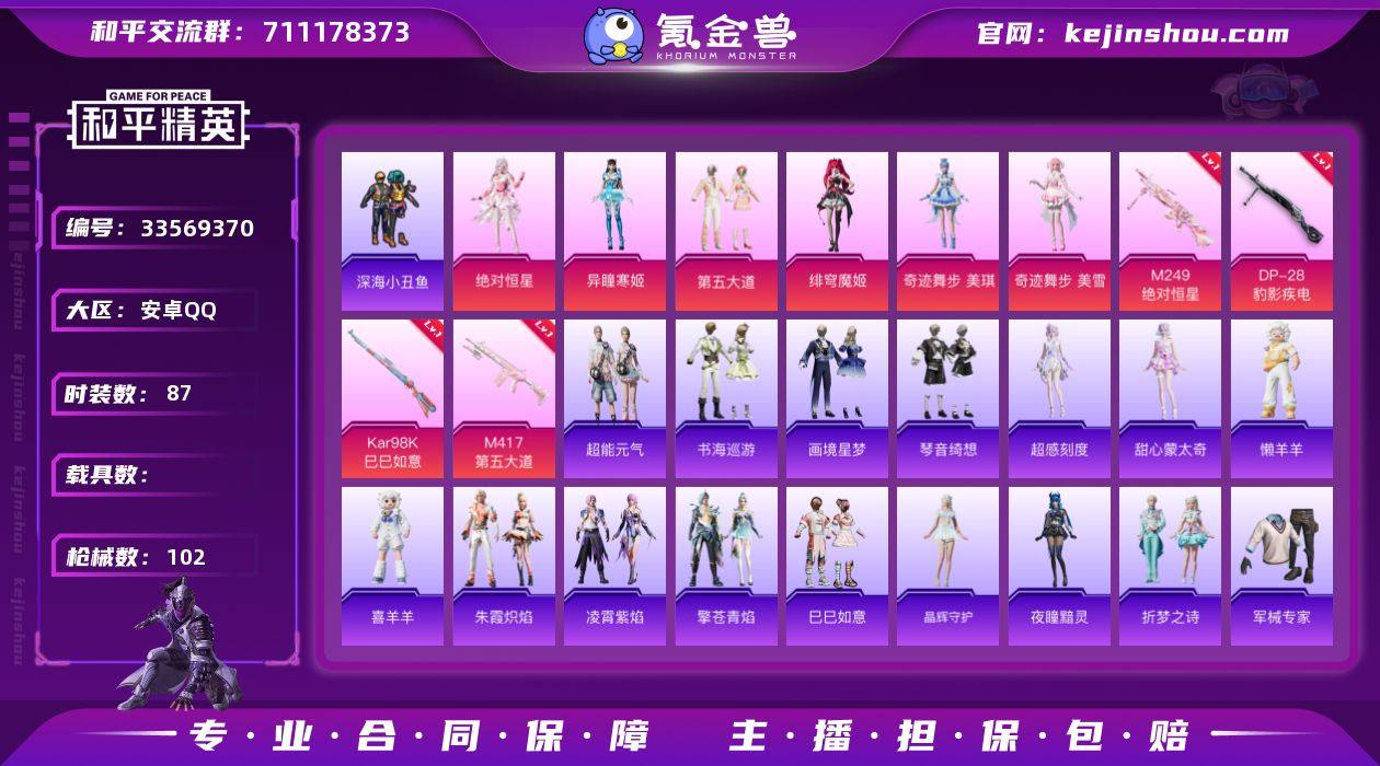 1587扭蛋碎片 小丑鱼主套 安卓 手Q-6粉装-6特效枪-0载具-2粉色飞行器-29872热力值-3王牌印记-87套装-102枪皮 【热门品类】:套装-深海小丑鱼 【粉色套装】:角色-绝对恒星,粉装-第五大道,角色-绯穹魔姬,角色-奇迹舞步 美琪,角色-奇迹舞步 美雪,角色-异瞳寒姬 【粉色枪皮等级】:UMP45-萌骑冒险(五级),Kar98K-巳巳如意(一级),Mk14-福马献瑞(一级),M417-第五大道(一级),M249-绝对恒星(一级),DP-28-豹影疾电(一级) 【粉色枪皮】:UMP45-萌骑冒险,Kar98K-巳巳如意,Mk14-福马献瑞,M417-第五大道,M249-绝对恒星,DP-28-豹影疾电 【粉色飞行器】:绝对恒星飞行器,炫彩糖果飞行器 【粉色降落伞】:绝对恒星降落伞,第五大道降落伞,雪月幻音降落伞,绯穹魔姬降落伞,炫彩糖果降落伞,鸢尾珑雾降落伞 【稀有套装】:套装-巳巳如意,套装-超能元气,角色-超感刻度,角色-甜心蒙太奇,套装-雪国风尚,套装-炫彩糖果,套装-顽皮橙,套装-马上来财,套装-迅捷龙虾,套装-晶辉守护,角色-夜瞳黯灵,套装-折梦之诗,套装-朱霞炽焰,套装-凌霄紫焰,套装-擎苍青焰,玩偶服-懒羊羊,玩偶服-喜羊羊,套装-书海巡游,套装-画境星梦,套装-琴音绮想,角色-霜刃之御,套装-月光旧梦...