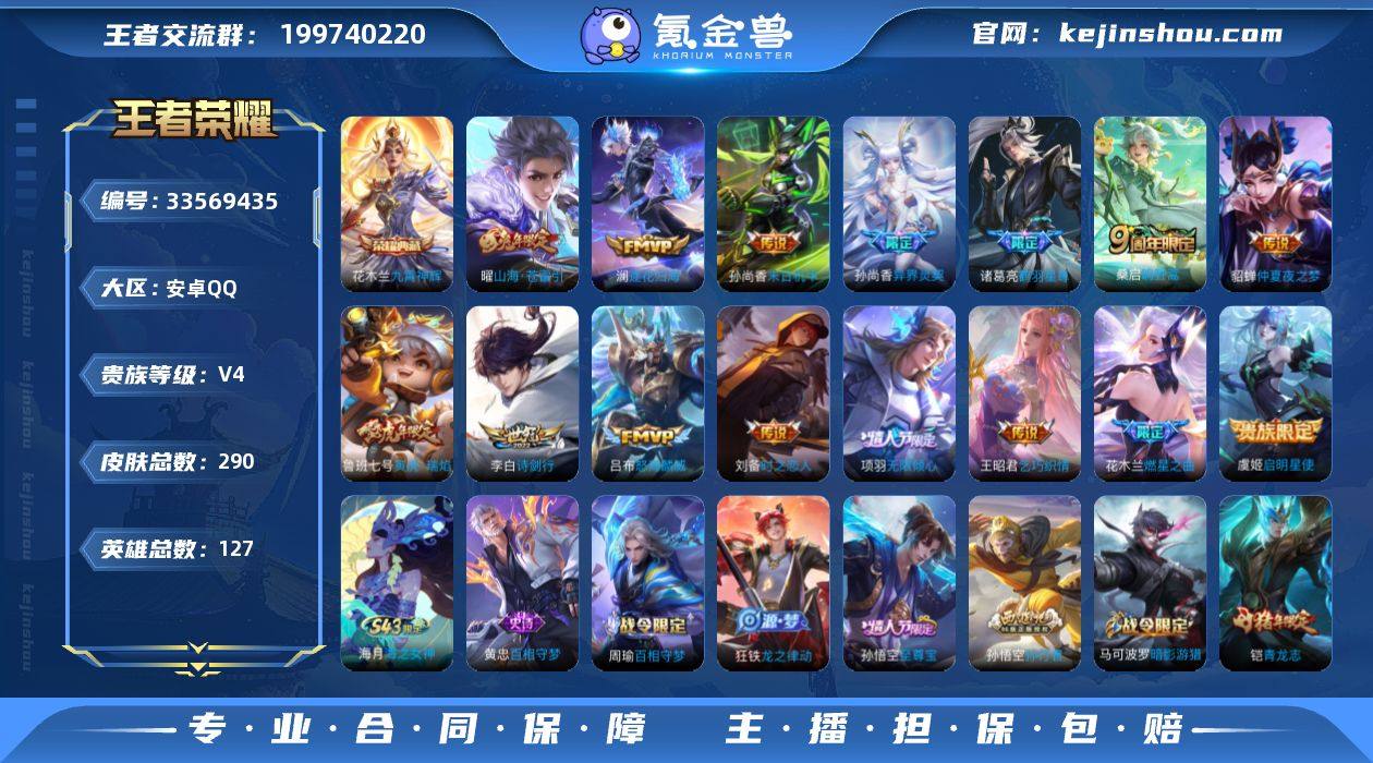 安卓Q-V4-至尊星耀V段位-127英雄-290皮肤-1典藏皮肤-15传说-81史诗 【英雄全皮】:敖隐全皮 【荣耀典藏】:花木兰九霄神辉 【传说皮肤】:桑启鸣野蒿,澜逐花归海,诸葛亮鹤羽星尊,花木兰燃星之曲,项羽无限倾心,曜山海苍雷引,吕布怒海麟威,李白诗剑行,鲁班七号寅虎瑞焰,孙尚香异界灵契,王昭君乞巧织情,虞姬启明星使,刘备时之恋人,貂蝉仲夏夜之梦,孙尚香末日机甲 【限定皮肤】:蒙犽顽岩魄,蔡文姬夏日便利店,大乔绒语心约,虞姬夏日便利店,姜子牙天穹之誓,杨戬破阵退雄兵,狄仁杰阴阳师,赵云皇家上将,赵云百木心枪,孙尚香异界灵契,鲁班七号寅虎瑞焰,庄周高山流水,高渐离玩趣恶龙,钟无艳王者之锤,钟无艳超时空战士,扁鹊奇幻香踪,元歌无心,甄姬落雪兰心,马可波罗暗影游猎,马可波罗山海玄木吟,狄仁杰魔术师,狄仁杰万华元夜,达摩星际陆战队,达摩沙漠行僧,项羽海滩派对,项羽无限倾心,关羽冰锋战神,程咬金演武夺筹,王昭君午后时光,兰陵王金庭之子,花木兰青春决赛季,花木兰默契交锋,花木兰燃星之曲,孙悟空至尊宝,孙悟空孙行者,李元芳云中旅人,虞姬启明星使,钟馗驱傩正仪,杨戬潮玩骑兵,雅典娜黎明之约,鬼谷子五谷丰年,诸葛亮鹤羽星...