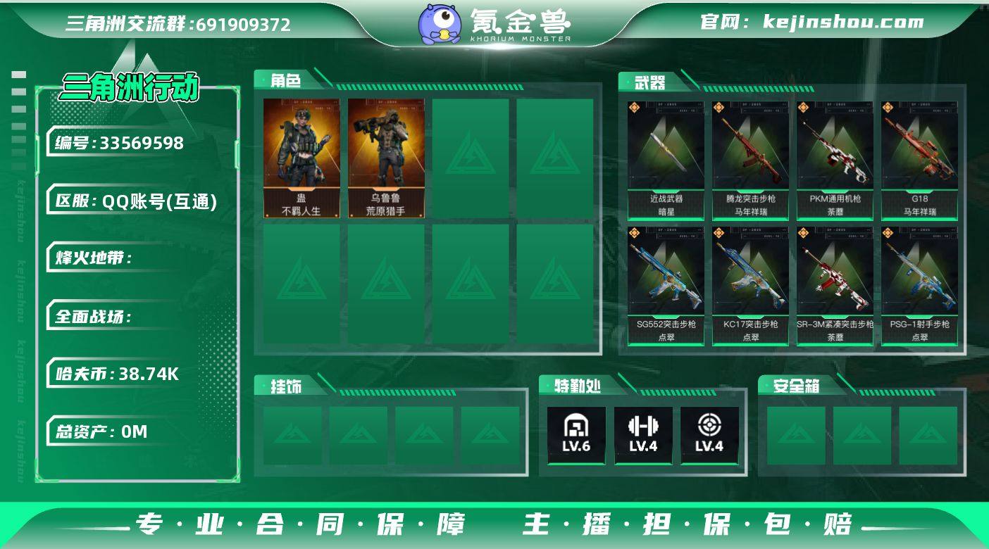 142m总资产-38747k哈夫币-60烽火等级-钻石-20战场等级-上等兵 【干员外观】:乌鲁鲁-荒原猎手,蛊-不羁人生 【近战皮肤】:近战-暗星,近战-黑鹰 【传说外观】:K416突击步枪-行动记录,SG552突击步枪-点翠,SCAR-H战斗步枪-荼蘼,腾龙突击步枪-马年祥瑞,腾龙突击步枪-万金泪冠,KC17突击步枪-点翠,MK47突击步枪-暗星,SR-3M紧凑突击步枪-暗星,SR-3M紧凑突击步枪-荼蘼,勇士冲锋枪-万金泪冠,PKM通用机枪-荼蘼,M14射手步枪-蛮荒,M14射手步枪-缄花,SR-25射手步枪-缄花,PSG-1射手步枪-点翠,AWM狙击步枪-万金泪冠,.357左轮-缄花,G18-马年祥瑞 【史诗外观】:K416突击步枪-腊梅,K416突击步枪-阿萨拉特攻,AUG突击步枪-蝮蛇,K437突击步枪-丛影谍踪,SR-3M紧凑突击步枪-开工大吉,勇士冲锋枪-丛影谍踪,MP7冲锋枪-六套之力,PKM通用机枪-阿萨拉特攻,M249轻机枪-丛影谍踪,M250通用机枪-囚徒,QJB201轻机枪-炽焰,VSS射手步枪-丛影谍踪,M14射手步枪-工业狂潮, M14射手步枪-航天庆典,SV-98狙击步枪-猎鳄行动 【稀有外观】:K416突击步枪-一帆风顺,SG552突击步枪-马年新春,SG552突击步枪-贴花艺术, AK-12突击步枪-马年新春,G3战斗步枪-猛禽,CAR-15突击步枪-来财,...
