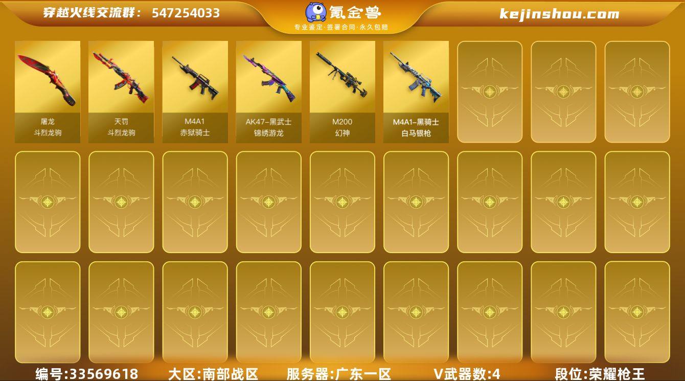 实名: 可修改 排位资格: 有 V武器: M200-幻神,AK47-黑武士-锦绣游龙,M4A1-赤狱骑士,屠龙-斗烈龙驹,天罚-斗烈龙驹 热门武器: 猫猫手套 英雄角色: 斗烈龙骑 亮点: 【热门武器】:M200-幻神