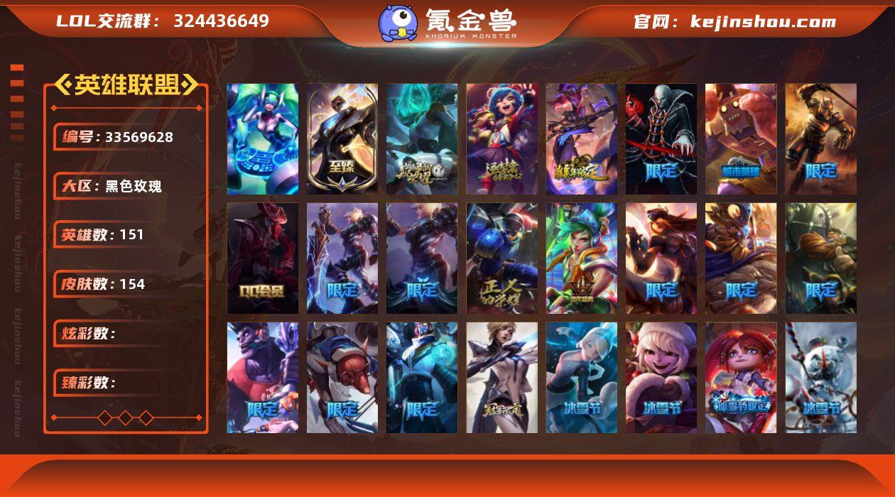 未定级段位-151英雄-154皮肤-0炫彩-1终极-3神话-22限定-9传说-42史诗 【热门头像】:卡特琳娜的匕首头像 【神话皮肤】:十周年纪念安妮,源代码乐芙兰 【至臻皮肤】:至臻未来战士锤石 【年限皮肤】:玉净夜叉凯特琳 【冰雪限定】:圣诞精灵崔丝塔娜,夺命美人卡特琳娜,冬季仙境奥莉安娜,雪默丁格,圣诞玩偶波比 【终极皮肤】:DJ娑娜 【限定皮肤】:诺斯费拉图弗拉基米尔,冠军之刃锐雯,冠军之刃锐雯2016,Fnatic古拉加斯,暗杀星蒙多,SSW图奇,SKTT1瑞兹,iG菲奥娜,电玩勇者锐雯,胜利女神希维尔,胜利之树茂凯,南瓜头费德提克,蒙多蒙多,红桃杰克崔斯特,防暴天使凯尔,警用试作体K9内瑟斯 【传说皮肤】:源计划林易,红色男爵库奇,地狱行者孙悟空,丧尸布兰德,第三类接触黑默丁格,符文战熊沃利贝尔,女校长菲奥娜,霸天异形卡兹克,星之守护者金克丝 【史诗皮肤】:绞肉机角斗士赵信,圣光审判凯尔,战争机器赛恩,战场公主希维尔,月光女神阿忒弥斯索拉卡,火牙狼人沃里克,荒野豺狼沃里克,黑帮狂花厄运小姐,炼金狂士辛吉德,死神卡尔萨斯,贵族血统萨科,飞越疯人院萨科,战争血统蒙多,海克斯科技迦娜,寒冰女皇迦娜,穿着正装的恶魔维迦,黑曜石守护者墨...