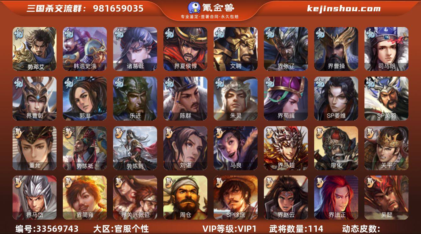 【JYSGS242】官阶:先锋及以下 VIP等级:VIP1级 史诗武将数:3 动态皮肤数:0 武将总数:114 史诗宝珠数:0 元宝数:365 将魂数:4814 /势邓艾/董允/界徐盛/谋田豫/界曹操/界夏侯惇/界张辽/界荀彧/郭淮/韩浩史涣/陈群/界曹彰/诸葛诞/SP关羽/SP姜维/文聘/乐进/司马朗/朱灵/张既/骥李典/华雄/袁术/势田丰/界华佗/界袁术/公孙瓒/李儒/蔡夫人/董白/王濬/友庞统/势陈到/势陈祗/界刘备/界赵云/界马超/界伊籍/廖化/关平/刘封/吴懿/周仓/张松/刘谌/界法正/界关兴张苞/界马岱/界简雍/马良/SP徐庶/谋韩当/界大乔/界陆逊/潘璋马忠/虞翻/界顾雍/诸葛瑾/孙鲁育/吕岱