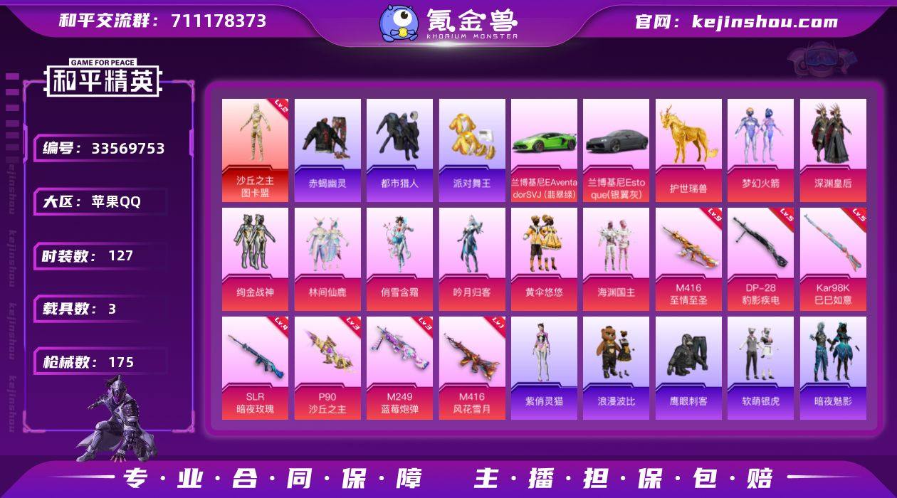 苹果 手Q-1神装-8粉装-9特效枪-3载具-4粉色飞行器-60964热力值-2王牌印记-127套装-175枪皮 【红色神装等级】:沙丘之主-图卡盟(二级) 【红色角色神装】:沙丘之主-图卡盟 【热门品类】:粉装-梦幻火箭,套装-浪漫天命,套装-赤蝎幽灵,套装-都市猎人,套装-派对舞王,套装-暗影哥特,套装-浪漫波比,角色-8号机,角色-Mark.06,熔岩游骑兵连帽夹克 【粉色套装】:粉装-深渊皇后,粉装-梦幻火箭,粉装-绚金战神,粉装-林间仙鹿,粉装-俏雪含霜,粉装-吟月归客,粉装-黄伞悠悠,粉装-海渊国主 【粉色枪皮等级】:M416-风花雪月(一级),M416-至情至圣(九级),ACE32-萌骑漫游(二级),P90-沙丘之主(三级),Kar98K-巳巳如意(五级),Mk14-福马献瑞(四级),SLR-暗夜玫瑰(四级),M249-蓝莓炮弹(三级),DP-28-豹影疾电(五级) 【粉色载具】:兰博基尼Aventador SVJ(翡翠绿),兰博基尼Estoque(银翼灰),护世瑞兽 【粉色枪皮】:M416-风花雪月,M416-至情至圣,ACE32-萌骑漫游,P90-沙丘之主,Kar98K-巳巳如意,Mk14-福马献瑞,SLR-暗夜玫瑰,M249-蓝莓炮弹,DP-28-豹影疾电 【粉色飞行器】:酣梦熊熊飞行器,炫彩糖果飞行器,万象金身飞行器,飞天猪飞行器 【粉色降落伞】:凝视深渊降...