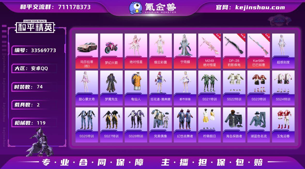 满级地铁安卓 手Q-3粉装-5特效枪-2载具-3粉色飞行器-34669热力值-2王牌印记-74套装-119枪皮 【热门品类】:套装-龟仙人 【粉色套装】:角色-绝对恒星,角色-烟云彩露,角色-宁雨蝶 【粉色枪皮等级】:Kar98K-巳巳如意(五级),Mk14-福马献瑞(二级),AA12-G-萌骑幻想(五级),M249-绝对恒星(五级),DP-28-豹影疾电(五级) 【粉色载具】:玛莎拉蒂Ghibli(粉),双人摩托-梦幻火箭 【粉色枪皮】:Kar98K-巳巳如意,Mk14-福马献瑞,AA12-G-萌骑幻想,M249-绝对恒星,DP-28-豹影疾电 【粉色飞行器】:绝对恒星飞行器,炫彩糖果飞行器,梦幻火箭飞行器 【粉色降落伞】:绝对恒星降落伞,梦幻火箭降落伞,第五大道降落伞,仲夏莫吉托降落伞,鸢尾晶梦降落伞,幻彩电音降落伞,冷漠罗丽降落伞,炫彩糖果降落伞 【稀有套装】:套装-龟仙人,角色-超感刻度,角色-甜心蒙太奇,套装-雪国风尚,套装-炫彩糖果,角色-狂花道·雅典娜,角色-都市丽猫,角色-碧青流霞 【稀有枪皮】:AUG-冰晶雪宝,AKM-星兔领航员,AKM-龙的传人,M16A4-幻世战舞者,SCAR-L-红色方程式,M416-糯团青竹,GROZA-懵萌河马,GROZA-田园牧歌,AUG-天降萌叽,AUG-耀粉歌者,AUG-绝对恒星,QBZ-银碳小老虎,M762-天降萌...