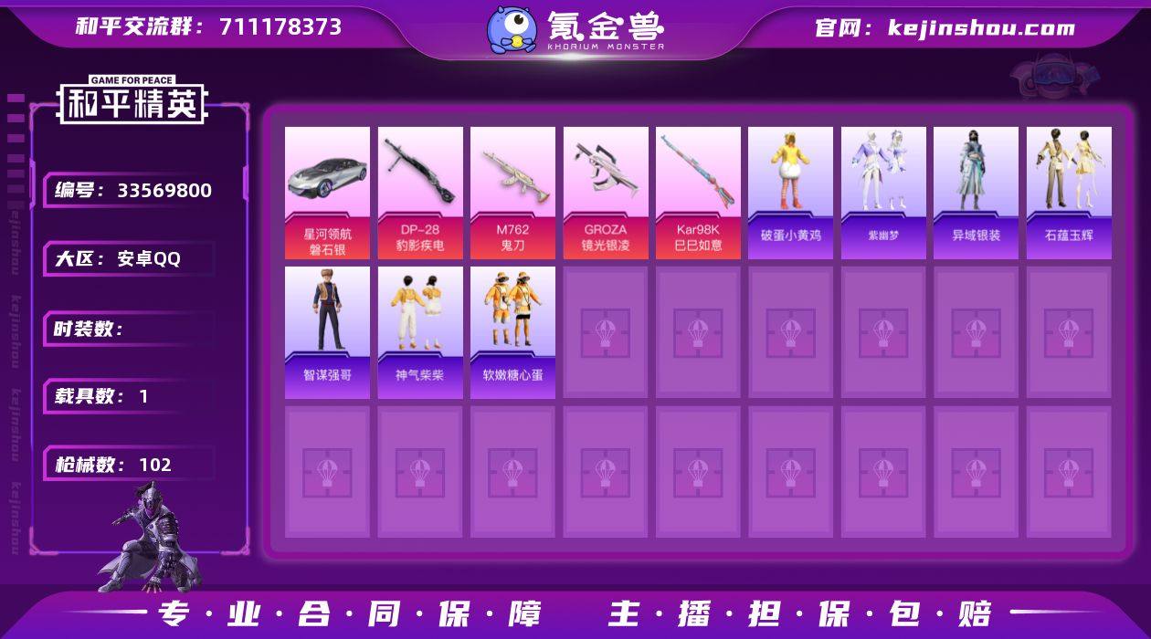 1载具-57套装-102枪皮-安卓手Q-4王牌印记-1粉装-6特效枪-1载具-28548热力值-57套装-102枪皮 【1粉装】角色-虹云熊熊 【6特效枪】Mk14-福马献瑞/2级,UMP45-萌骑冒险/4级,DP-28-豹影疾电/5级,M762-鬼刀/4级,Kar98K-巳巳如意/5级,GROZA-镜光银凌/5级 【1稀有载具】星河领航(磐石银) 【52稀有时装】虹云熊熊,SS38特训,石蕴玉辉,异域银装,白糯汤圆,街头风暴,鱼渊荷华,青团波波,大橘大利,燕燕于飞,战术大师,智谋强哥,糖糖葫芦,瑰梦爱神,彩虹兔,极速光影,雪绒豹,云魄琉璃,云朵鹅,蓝冰羽,恋语绒绒,紫幽梦,SS31特训,SS33特训,SS32特训,SS36特训,福星高照,软嫩糖心蛋,SS37特训,白色伏地魔,绯格组合,SS34特训,竞技名士,深蓝色名流,SS30特训,长空猛禽,街头潮人,怒火燎原,幻世战舞者,狙击之神,红釉青花,雨过天青,玲珑侠影,破蛋小黄鸡,疯狂小兔子,森林游猎者,耀粉歌者,SS17特训,光之冒险,缤纷果语,神气柴柴,鹤鸣 【94稀有枪械】GROZA-镜光银凌/5级,M762-鬼刀/4级,Kar98K-巳巳如意/5级,Mk14-福马献瑞/2级,UMP45-萌骑冒险/4级,DP-28-豹影疾电/5级,MK12-乌木金纹,PKM-紫幽梦,MG3-霓彩脉冲,Mk14-紫幽梦,蜜獾-乌木金纹,M762-云朵鹅,S1897-紫幽梦,SVD-云朵鹅,P92-紫幽梦,M417-玩趣呆呆,ARX-像素花...