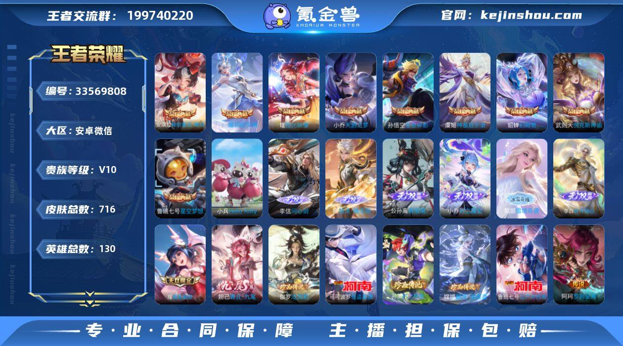 实名: 可修改 性别: 女号 贵族等级: V10 英雄数: 130 皮肤数: 716 荣耀水晶: 武则天,天鹅之梦,星空梦想,倪克斯神谕,全息碎影,幻阙歌,神鉴启示录,拾光映像,最初的交响,颠倒童话·魔镜 小兵皮肤: Hello Kitty 无双皮: 真我赫兹(瑶),青丘·九尾,碎月剑心,小乔时之魔女,离恨烟,雪境奇遇-甄姬,器灵·螭龙剑,问心剑 珍品传说: 江户川柯南,怪盗基德,时之奇旅-孙策,器灵·落星盏,沧流箭 传说皮: 黄金狮子座,黄金射手座,冠军飞将,云鹰飞将,绛天战甲,黄金白羊座,猫影幻舞,久胜战神,炽阳神光,一念神魔,云霓雀翎,末日机甲-孙尚香,地狱火,仲夏夜之梦,音你心动-小乔,零号·赤焰,海洋之心,地狱之眼,飞鸢探春,音你心动-周瑜,胖达荣荣,李逍遥,乞巧织情,时之恋人-刘备,游龙清影,淬星耀世,超时空战士-狄仁杰,遇见胡旋,末日机甲-孙策,花朝如约,挚爱之约,挚爱花嫁,无双飞将,音你闪耀,碎云,天秀幻梦,神器·狴犴令,山海·炽霜斩,山海·琳琅生,山海·苍雷引,炽翼辉光,燃星之曲,画中仙,浮生妄,记忆之芯,青丘·九尾,百相守梦(张飞),追逃游戏(亚瑟),追逃游戏(安琪拉),电玩·雷克斯,鹤羽星尊,灼幽烈阳,妄想实况,妄想奇谈,鹤归松栖(云缨),惊梅引,遇见神鼓,鲁班七号-时之奇旅,大乔-时之奇旅,永恒水手月亮,夜礼服假面,小...