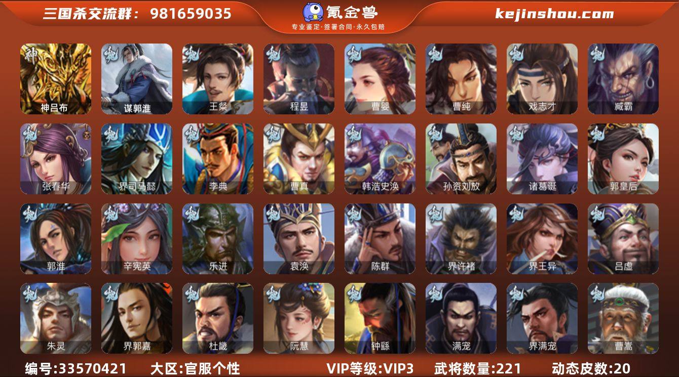 神吕布,王粲,曹婴,曹纯,戏志才,程昱,沙摩柯,谯周,界朱然,界徐盛,星甘宁,沮授,界左慈,界李儒,士燮,谋郭淮,SP关羽,SP曹仁,乐进,曹昂,诸葛诞,朱灵,文聘,SP姜维,张春华,钟会,曹冲,郭淮,满宠,界王异,界曹操,界司马懿,界夏侯惇,界张辽,界许褚,界郭嘉,李典,曹真,韩浩史涣,陈群,钟繇,司马朗,郭皇后,孙资刘放,辛宪英,吕虔,杜畿,界曹植,界满宠,袁涣,阮慧,曹嵩,臧霸,SP孙尚香,关银屏,夏侯霸,马良,关兴张苞,廖化,界马岱,关平,刘封,界法正,界关兴张苞,界刘备,界张飞,界马超,SP徐庶,吴懿,周仓,张松,黄皓,界诸葛亮,严颜,张翼,邓芝,界简雍,界周仓,彭羕,界张嶷,谋张飞,诸葛果,甘夫人,大乔小乔,诸葛瑾,孙鲁育,程普,韩当,潘璋马忠,虞翻,界甘宁,界吕蒙,界黄盖,界周瑜,界大乔,界陆逊,孙鲁班,朱桓,顾雍,孙休,全琮,界孙权,潘濬,许贡,孙邵,蒋钦,界顾雍,界孙鲁班,濮阳兴,孟达,友徐庶,伏完,界袁术,张宝,伏皇后,李儒,华雄,袁术,界华佗,界吕布,公孙瓒,蔡夫人,公孙渊,张鲁,严白虎,SP黄月英,曹节,蔡邕,界貂蝉,卢植,界庞德,界董卓,刘繇,界高顺,界刘表,界公孙瓒,丁原,荀谌,羊祜,谋高顺,贾充,势...