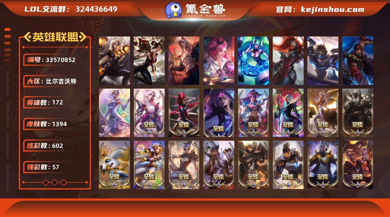 t40038 皇冠账号【比尔吉沃特】联盟不朽卡莎 殿堂传奇卡莎 金蛇巨星瑟提 1395皮肤 602炫彩 57臻彩 50神话/290限定/119传说/172英雄 账号等级:470 云顶神话:1 【重要头像】爱情之歌 银河魔装机神安妮 周年男刀图标 周年女刀图标 萨勒芬妮超级巨星 萨勒芬妮独立音乐人 卡特琳娜的匕首 小希 神龙尊者艾希炫彩 神龙尊者艾希 万圣节卡特琳娜 小斗 小多 星守金克丝炫彩 小望与小牙 小智 电玩女神厄运小姐 电玩女神凯特琳 沐浴震惊 送披萨的小姐姐希维尔 西部魔影卡特琳娜炫彩 西部魔影莎弥拉炫彩 至臻战斗学院蕾欧娜 至臻福牛守护者菲奥娜 至臻KDA卡莎 【重要皮肤】联盟不朽卡莎 殿堂传奇卡莎 金蛇巨星瑟提 机神玄武盖伦至臻 灵魂莲华拉克丝至臻 黑色玫瑰假面舞会卡特琳娜至臻 暗星女王黛安娜至臻 幻灵狮心蕾欧娜至臻 至高天凯尔至臻 西部魔影伊芙琳至臻 天龙之子伊泽瑞尔至臻 北极星钢影卡蜜尔至臻 绝息圣堂厄运小姐至臻 剪纸仙灵希维尔至臻 至高天奎桑提至臻 海珀利安小队X09星环灵风迦娜至臻 星之守护者艾克至臻 幻灵战斗猫金克丝至臻 青花瓷拉克丝至臻 神凰行者烈羽焰凰霞至臻 战斗学院蕾欧娜至臻 未来战士卢锡安至臻 真实伤...