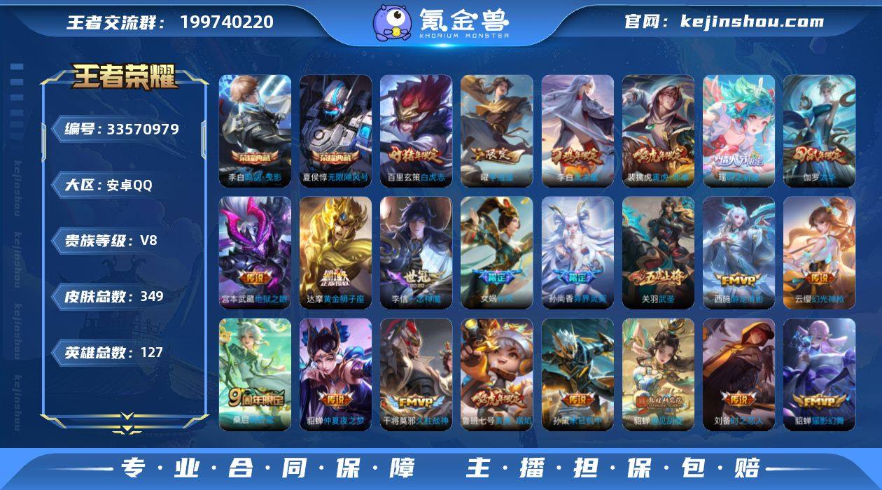 安卓QQ/绝世王者/349皮肤/127英雄/2典藏/0珍品无双/0无双/1珍品传说/35传说/103史诗/8稀有英雄 【1 珍品传说】沧流箭 伽罗, 【2 典藏皮肤】鸣剑·曳影 李白,无限飓风号 夏侯惇, 【35 传说皮肤】胖达荣荣 梦奇,武圣 关羽,启明星使 虞姬,云霓雀翎 虞姬,花朝如约 蔡文姬,时之祈愿 瑶,飞鸢探春 李元芳,白虎志 百里玄策,李逍遥 曜,补天 女娲,游龙清影 西施,凤求凰 李白,遇见胡旋 貂蝉,猫影幻舞 貂蝉,仲夏夜之梦 貂蝉,神骥·鸣幻洲 朵莉亚,地狱之眼 宫本武藏,音你心动 周瑜,寅虎·瑞焰 鲁班七号,乞巧织情 王昭君,时之恋人 刘备,黄金狮子座 达摩,久胜战神 干将莫邪,异界灵契 孙尚香,末日机甲 孙策,一念神魔 李信,音你心动 小乔,淬星耀世 赵云,太华 伽罗,绛天战甲 铠,寅虎·赤拳 裴擒虎,冠军飞将 花木兰,黄金白羊座 张良,幻光神枪 云缨,鸣野蒿 桑启, 【103 史诗皮肤】龙鼓争鸣 蒙犽,乒乒小将 鲁班七号,时之奇旅 安琪拉,电玩小子 鲁班七号,白昼王子 嬴政,逐梦之星 马可波罗,紫霞仙子 露娜,高山流水 庄周,银河之约 李元芳,匿光追影者 镜,暗渊魔法 司马懿,白鹤梁神女 大乔,天秀·启明 杨戬,狮舞东方 鲁班七号,妄想食味 姬小满,德古拉伯爵 刘邦,心灵战警 亚瑟,五谷丰年 鬼谷子,诗语江南 西施,...