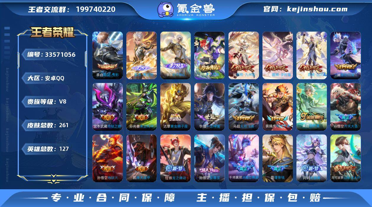 安卓QQ/荣耀王者/261皮肤/127英雄/1典藏/0珍品无双/2无双/1珍品传说/22传说/66史诗/8稀有英雄 【1 珍品传说】时之奇旅 孙策, 【1 典藏皮肤】鸣剑·曳影 李白, 【2 无双皮肤】碎月剑心 李白,器灵·螭龙剑 曜, 【22 传说皮肤】启明星使 虞姬,纵目迁山 杨戬,逐花归海 澜,无双飞将 马超,九山相柳 司马懿,地狱火 孙悟空,齐天大圣 孙悟空,神骥·赴朔漠 狄仁杰,神骥·逐星野 马超,地狱之眼 宫本武藏,神骥·越千峰 云缨,黄金狮子座 达摩,末日机甲 孙尚香,一念神魔 李信,绛天战甲 铠,千山共赴 干将莫邪,愿照·九州拓 澜,神树通天 后羿,愿照·山河定 司空震,祥瑞亨通 裴擒虎,愿照·岁时盈 虞姬,鸣野蒿 桑启, 【66 史诗皮肤】白昼王子 嬴政,高山流水 庄周,冰霜恋舞曲 干将莫邪,妄想食味 姬小满,德古拉伯爵 刘邦,山海·玄木吟 马可波罗,心灵战警 亚瑟,五谷丰年 鬼谷子,鬼剑武藏 宫本武藏,线条小狗 周瑜,百晓客 明世隐,遇见飞天 杨玉环,摇滚巨星 嬴政,修罗 橘右京,魅力维加斯 妲己,黄金分割率 诸葛亮,偶像歌手 王昭君,女仆咖啡 妲己,赏金猎手 澜,九幽镇关 项羽,晚萤 娜可露露,舞动绿茵 蔡文姬,鹰眼统帅 狄仁杰,李小龙 裴擒虎,光弋星穹 莱西奥,纤云弄巧 云中君,金属风暴 墨子,特工魅影 百里守约,原初...