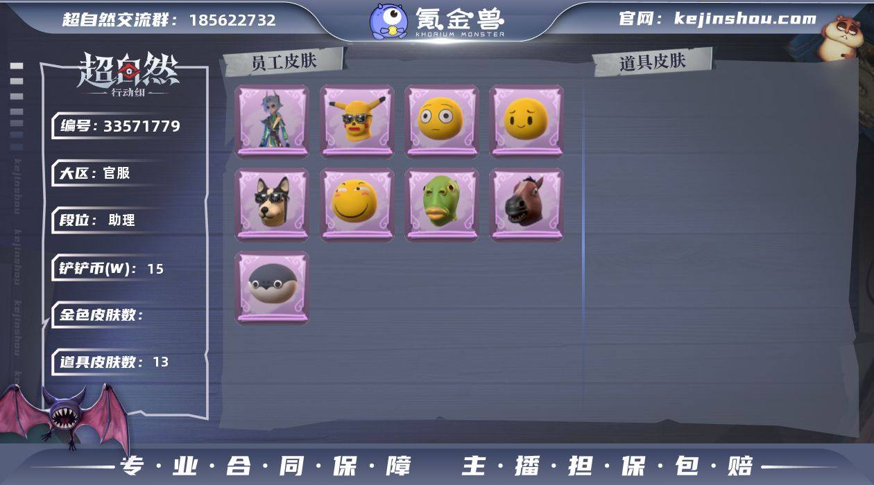 ZR947,紫皮:1,外观:逍遥-泽引山海,饰品:头饰-嘻嘻头套,头饰-哈士奇头套,头饰-呆滞头套,头饰-卑微头套,头饰-滑稽头套,头饰-萨卡班甲鱼头套,头饰-鱼头怪头套,头饰-面具马头套,头饰-烈焰红唇头套,头饰-后室幸存者头套,挂饰-未竟乐园,动作:动作-举牌,动作-抬手,工牌背景:工牌背景-蓝海奇遇,员工:零,小黄,逍遥,爱丽丝,累充:54元,铲铲币:15.1万,金砖:8,段位:助理Ⅲ,魔盒等级:1