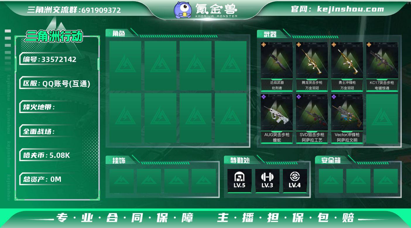 18m总资产-5085k哈夫币-53烽火等级-黄金-46战场等级-军士长 【近战皮肤】:近战-处刑者1级,近战-黑鹰 【传说外观】:K416突击步枪-行动记录,腾龙突击步枪-万金泪冠,KC17突击步枪-电锯惊魂,勇士冲锋枪-万金泪冠,SKS射手步枪-骑士,AWM狙击步枪-万金泪冠 【史诗外观】:AKM突击步枪-逆战未来,AUG突击步枪-蝮蛇,MP5冲锋枪-竞技风,Vector冲锋枪-阿萨拉文明,Vector冲锋枪-异域战争,SMG-45冲锋枪-阿萨拉特攻,MP7冲锋枪-六套之力,SVD狙击步枪-阿萨拉工艺,M14射手步枪-工业狂潮,M700狙击步枪-哈夫克警备 【稀有外观】:M4A1突击步枪-行动开启,AKM突击步枪-肃杀,K416突击步枪-一帆风顺,AUG突击步枪-全金属外壳,SG552突击步枪-2026,AK-12突击步枪-前沿科技,SCAR-H战斗步枪-荣耀列队,MK47突击步枪-冰河潜伏者,MP5冲锋枪-弄臣,MP5冲锋枪-哈夫克卫队,P90冲锋枪-医疗协议,P90冲锋枪-贴花艺术,Vector冲锋枪-先锋,UZI冲锋枪-亚特兰蒂斯,野牛冲锋枪-冰河潜伏者,SMG-45冲锋枪-行动开启,SMG-45冲锋枪-幻影结构,勇士冲锋枪-冰天雪地,QCQ171冲锋枪-银鹭,M249轻机枪-战损,QJB201轻机枪-哈夫克卫队,Mini-14射手步枪-荣耀列队,SKS射手步枪-弄臣,SR9射手步枪-肃杀...