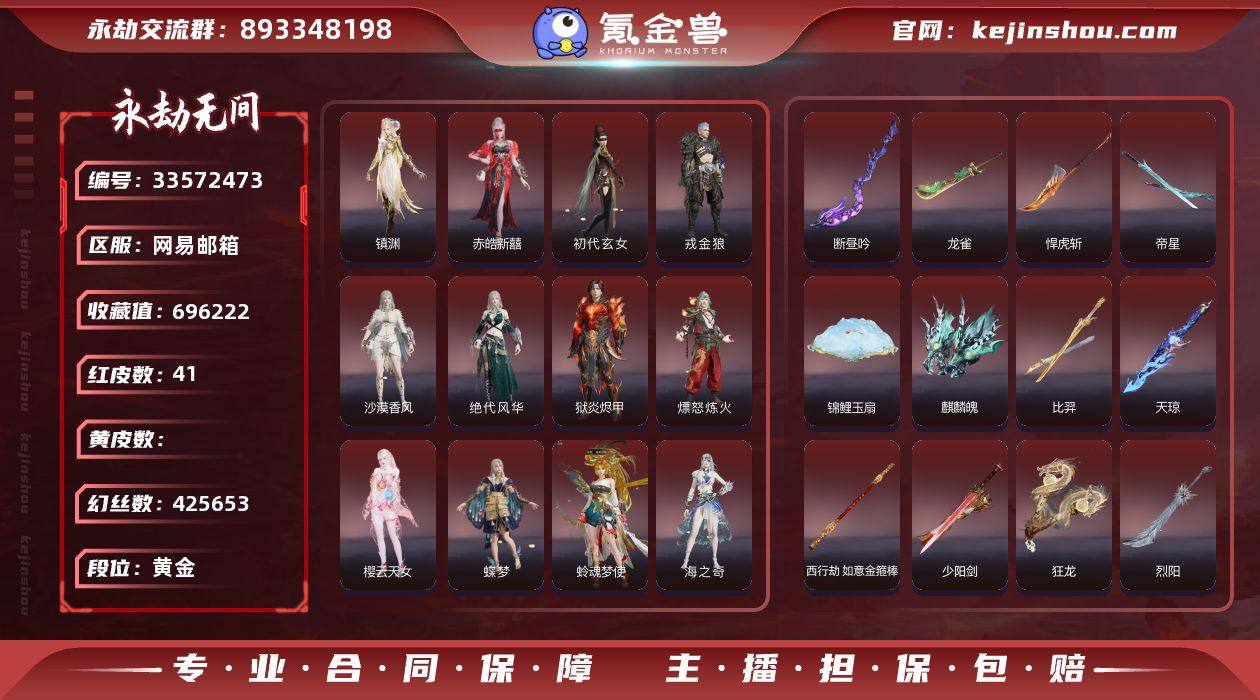 WJ6169,网易QQ邮箱,5月17日可换绑,41红948金,等级398,收藏值696222,三人段位黄金5,幻丝425653,金砖378,通行证Lv.3,声望12,夜蔷薇,西行劫神君印,红色神品,墨离,凌霄之羽,香雪水兰,暮光胴丸,绝代风华,沙漠香风,夜魅游莹,星辉魔纱,流金晓锦,画中仙,征天白龙,镇渊,新倩女幽魂长天藏锦,赤皓新囍,初代玄女,戎金狼,狱炎烬甲,熛怒炼火,樱云天女,蝶梦,阴阳师蛉魂梦使,泣珠龙纱,海之奇,青龙将星,毕方,麒麟魄,帝星,比羿,龙雀,烈阳,狼主,悍虎斩,灵犀,西行劫如意金箍棒,天琼,锦鲤玉扇,狂龙,少阳剑,冰魄,断昼吟,灵狐幻刃,角色金色皮肤,夏日派对仲夏霜华,梨园传奇小青,寒英素雪,砥砺筋骨篮板天才,苍雷丸,共赴无间赤焰舞影,倾国倾城闭月,倒反阴阳凛冬,巅峰极速蕾雅,拳皇不知火舞,千秋匠心玉叶景,观山海青鸟,西行劫白骨夫人,火罗圣女,龙门飞天,轩辕剑拓跋玉儿,浣烟纱,花无痕,金羽圣鹰,月轮魅影,瀚海苍鹰,福瑞天泽,观山海秋神蓐收,西行劫悟空,行空裘,斑斓衣,冬无归,炽火照夜,封神录哪吒,夏日派对盛夏白阳,干将莫邪,护世四法持国天王,百战断链,观山海冬神玄冥,无常白袍,共赴无间幽夜玲珑,倾国倾城...