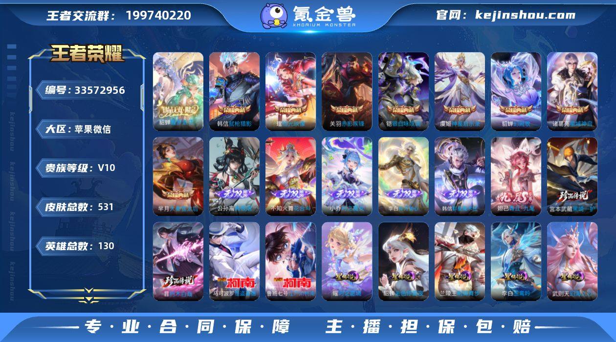 【106】 微信封禁苹果WX-V10-最强王者段位-129英雄-531皮肤-8典藏皮肤-1典藏英雄-1珍品无双-6无双-4珍品传说-79传说-178史诗 【英雄全皮】:高渐离全皮,姜子牙全皮,刘邦全皮,孙权全皮,鬼谷子全皮,百里玄策全皮,云中君全皮,盾山全皮,猪八戒全皮,敖隐全皮,阿古朵全皮,夏洛特全皮,金蝉全皮,暃全皮,空空儿全皮,海诺全皮 【荣耀典藏】:武则天英雄,芈月大秦宣太后,诸葛亮星域神启,关羽赤影疾锋,铠银白咏叹调,貂蝉幻阙歌,韩信弑枪猎影,虞姬神鉴启示录,瑶拾光映像 【珍品无双】:貂蝉馥梦繁花 【无双皮肤】:公孙离离恨烟,不知火舞花合斗,韩信群星魔术团,小乔时之魔女,李白碎月剑心,妲己青丘九尾 【珍品传说】:宫本武藏黑崎一护,暃朽木白哉,鲁班七号江户川柯南,马可波罗怪盗基德 【传说皮肤】:后羿神树通天,桑启鸣野蒿,庄周牧神诗旅,夏侯惇霜北刀,铠冥王哈迪斯,朵莉亚心动手记,云中君群星魔术团,海月金乌负日,亚连落雪白狼,吕布曦玄引,貂蝉曦玄引,典韦战鼓燎原,孙尚香乘龙问璇玑,孙策乘龙淬吴钩,赵云乘龙铭钟鼎,马超琥珀纪元,铠琥珀纪元,澜逐花归海,艾琳觅芳踪,露娜霜月吟,狄仁杰夜礼服假面,王昭君永恒水手月亮,鲁班七号时之...