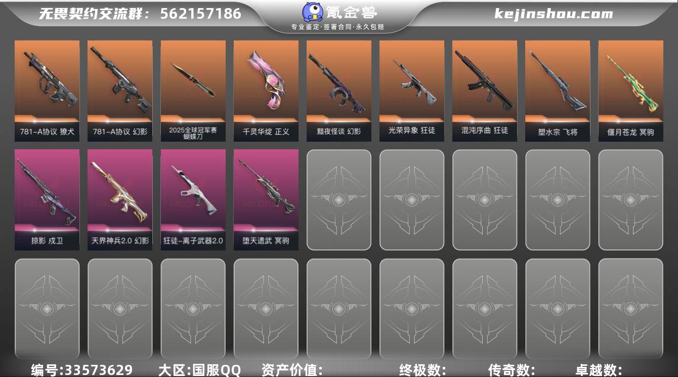 【sf572】【套装】:2025全球冠军赛套装,VCT 2026 赛季套装 【英雄】:幻棱,炼狱,维斯,暮蝶,钛狐,壹决,铁臂,捷风,雷兹,幽影,不死鸟,贤者,猎枭,蝰蛇,零,芮娜,奇乐,尚勃勒,霓虹,斯凯,夜露,星礈,K/O,海神,盖可,黑梦,钢锁 【近战武器】:近战武器-2025全球冠军赛 蝴蝶刀,近战武器-蒙太奇 战斧,近战武器-素竹扇,近战武器-碎心裂刃,近战武器-VCT 2026 篆刀,近战武器-黑波之刃,近战武器-镭切,近战武器-威龙之刃,近战武器-流星兵团 短剑,近战武器-金角扇,近战武器-诡秘蛇影 军刀,近战武器-星际猎兵 短剑 【狂徒】:狂徒-2025全球冠军赛,狂徒-混沌序曲,狂徒-奇点//2.0,狂徒-RGX 11z Pro,狂徒-光荣异象,狂徒-多弥尔的复仇,狂徒-ORA x 颗秒,狂徒-超时空卫队,狂徒-离子武器//2.0,狂徒-流星兵团,狂徒-诡秘蛇影 【幻影】:幻影-黯夜怪谈,幻影-781-A协议,幻影-天界神兵//2.0,幻影-蒙太奇,幻影-末日之翼 【戍卫】:戍卫-掠影,戍卫-赤焰铁骥,戍卫-战术熊与伙伴们,戍卫-折光棱晶 【獠犬】:獠犬-781-A协议 【冥驹】:冥驹-偃月苍龙,冥驹-堕天遗武 【飞将】:飞将-塑水宗,飞将-战术熊与伙伴们,飞将-末日之翼 【莽侠】:莽侠-RGX 11z P...