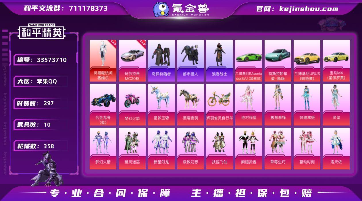苹果 手Q-1神装-18粉装-16特效枪-10载具-5粉色飞行器-134295热力值-20王牌印记-297套装-358枪皮 【红色载具】:玛莎拉蒂MC20(幻星粉)(二级) 【红色神装等级】:灵猫魔法师-塞维尔(二级) 【红色角色神装】:灵猫魔法师-塞维尔 【热门品类】:粉装-梦幻火箭,套装-浪漫天命,套装-都市猎人,套装-小丑鱼,套装-奇异狩猎者,套装-金羽特工,套装-浪客战士,套装-AG战队服,套装-暗影哥特 【粉色套装】:角色-绝对恒星,粉装-精灵迷巫,粉装-梦幻火箭,粉装-新星烈龙,粉装-极致幻想,粉装-扶摇飞仙,粉装-鳞翅贤者,粉装-草莓生巧,粉装-馨动时刻,角色-洛天依,粉装-光明术士,角色-千金淑猫,粉装-星穹咏叹调,角色-狂魅哈莉,角色-绯穹魔姬,角色-灵玺,角色-异瞳寒姬,粉装-极意拳锋 【粉色枪皮等级】:AKM-梦之光华(一级),AKM-幻海仙踪(七级),M416-五爪金龙(一级),M416-心之恋语(六级),M416-灵猫魔法师(三级),AUG-星梦奇缘(三级),AUG-暖羊咩咩(一级),M762-激战未来(一级),M762-冷魅冰骑(五级),蜜獾-异瞳寒姬(四级),Kar98K-巳巳如意(五级),AMR-智耀战神(四级),M249-绝对恒星(二级),DP-28-豹影疾电(五级),烟雾弹-丁香清露(五级),破片手榴弹-热量炸弹(六级)...