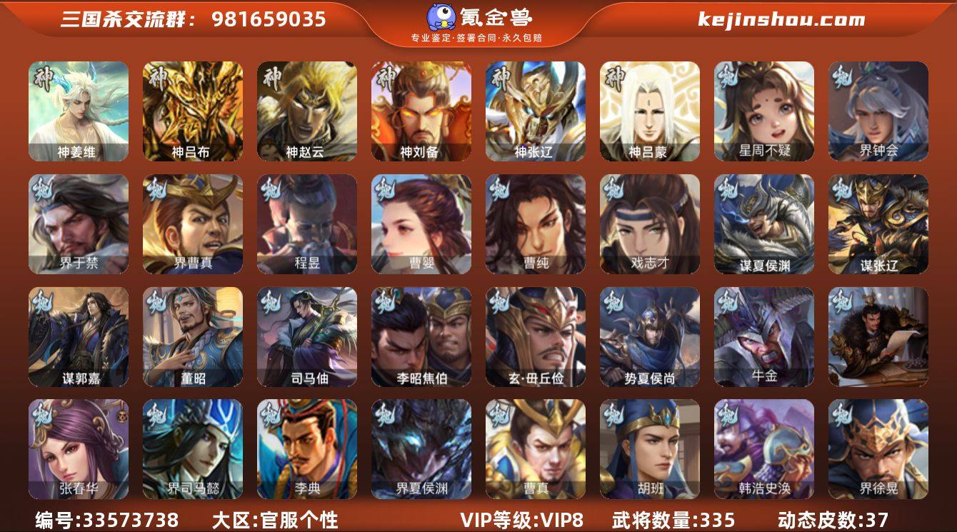 【14790239】官阶:大将军;VIP等级:VIP8;史诗武将数量:39;动态皮肤数量:37;武将总数:335;史诗宝珠数量:14;将魂数量:92;神将:5;魏国史诗武将:16;蜀国史诗武将:9;吴国史诗武将:5;群史诗武将:13