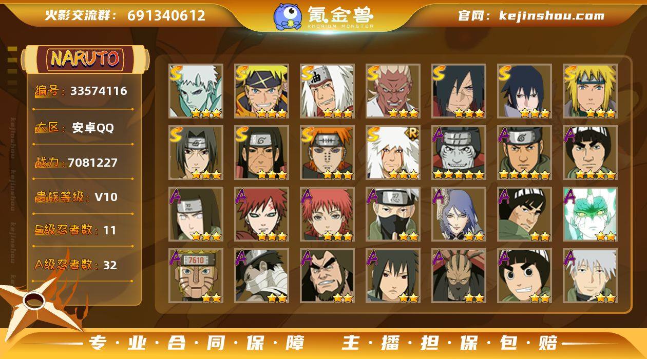 战斗力:700W+;段位:中忍1阶;本服排名:1165;VIP:V10级;S忍:11个;A忍:28个;通灵兽:15个 九喇嘛水门72片 忍战带土53片 忍战大野木50片