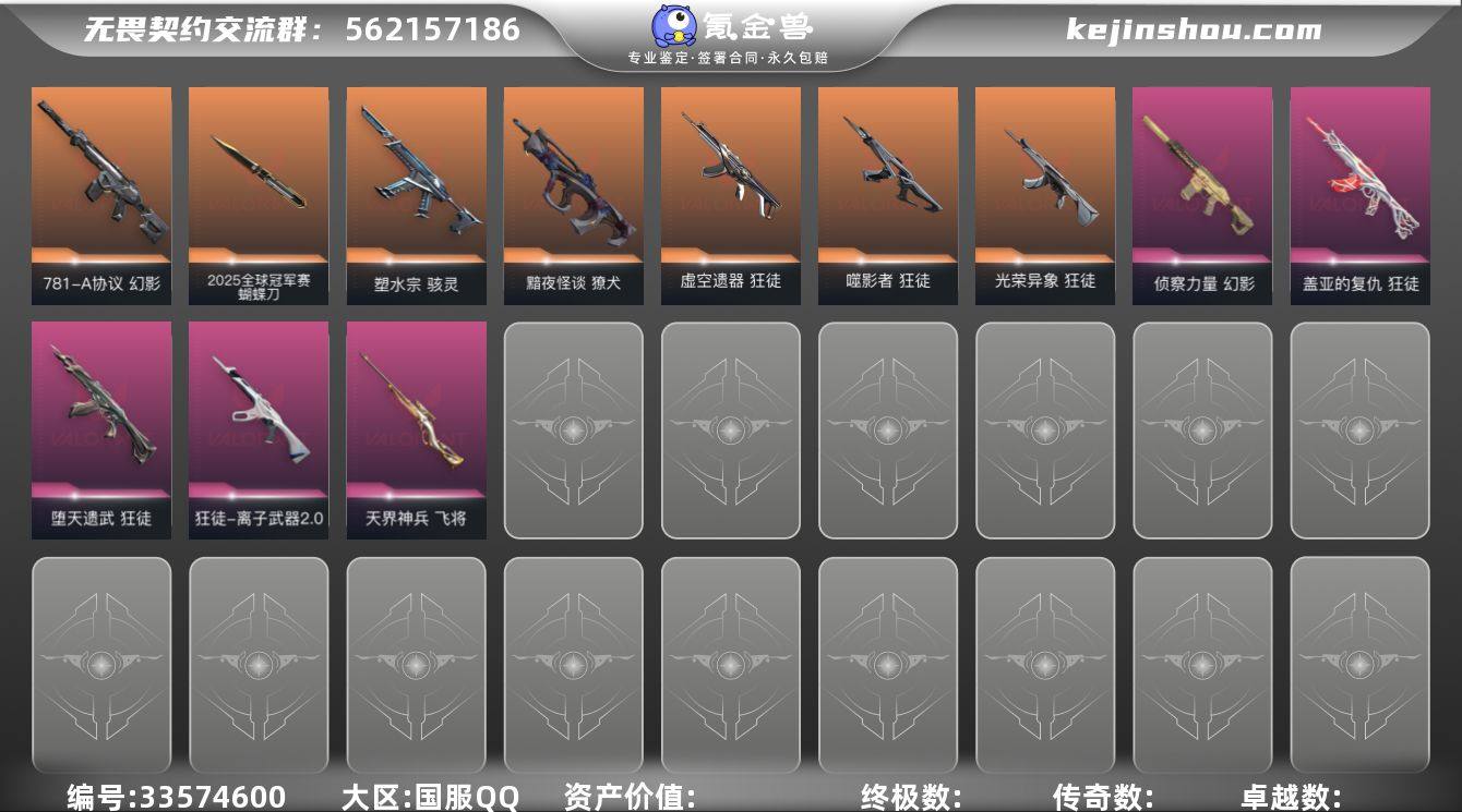 【sf591】【套装】:2025全球冠军赛套装,2022全球冠军赛套装,无畏契约季前邀请赛套装,回火礼包// V25套装,VCT 2025 赛季套装 【英雄】:幻棱,炼狱,维斯,暮蝶,钛狐,壹决,铁臂,捷风,雷兹,幽影,不死鸟,贤者,猎枭,零,芮娜,奇乐,尚勃勒,霓虹,斯凯,K/O,黑梦 【近战武器】:近战武器-2025全球冠军赛 蝴蝶刀,近战武器-2022全球冠军赛 蝴蝶刀,近战武器-无畏契约季前邀请赛 悲悯之刃,近战武器-剥皮小刀,近战武器-VCT 2025 爪刀,近战武器-天御刀,近战武器-诡秘蛇影 军刀,近战武器-神圣领域 战刀,近战武器-日耀风暴 遗器,近战武器-阿特拉斯指挥部 甩棍,近战武器-星际猎兵 短剑 【狂徒】:狂徒-2025全球冠军赛,狂徒-创·纪元,狂徒-虚空遗器,狂徒-噬影者,狂徒-RGX 11z Pro,狂徒-光荣异象,狂徒-堕天遗武,狂徒-盖亚的复仇,狂徒-离子武器//2.0,狂徒-诡秘蛇影 【幻影】:幻影-2022全球冠军赛,幻影-末日泡泡,幻影-781-A协议,幻影-侦察力量,幻影-神圣领域,幻影-末日之翼 【戍卫】:戍卫-月球哨兵,戍卫-折光棱晶 【獠犬】:獠犬-黯夜怪谈,獠犬-神圣领域 【冥驹】:冥驹-星云暗涌 【飞将】:飞将-天界神兵,飞将-末日之翼 【莽侠】:莽侠-诡秘蛇影...