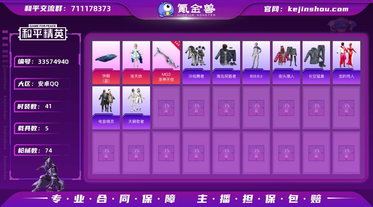 41套装/枪械9/装备86/载具5/战备53/王牌印记1/热力值34005/三级SCAR-L-灵驹仙姬/三级M416-天马神君/三级Vector-月中灵/四级AKS-74U-森灵之息/五级Mk14-福马献瑞/二级AA12-G-萌骑幻想/一级MG3-洛神天依/二级信号枪-金乌曜日/六级燃烧瓶-天降桃花/二级灵驹仙姬-云歌/二级法拉利LaFerrari(曜夜辉)/一级法拉利Purosangue(幻流光)/灵驹仙姬-云歌/角色-女王/洛天依/角色-月中灵/角色-霓裳阁主/法拉利LaFerrari(曜夜辉)/法拉利Purosangue(幻流光)/快艇-塞莎KL27(深潜蓝)/凌风神骏/九霄玄鹿/SCAR-L-灵驹仙姬/M416-天马神君/Vector-月中灵/AKS-74U-森灵之息/Mk14-福马献瑞/AA12-G-萌骑幻想/MG3洛神天依/信号枪-金乌曜日/燃烧瓶-天降桃花/香车宝马飞行器/云梦轻舟飞行器/霓裳阁主飞行器/冰狼掠影飞行器/六号石头人降落伞/洛神天依降落伞/霓裳阁主降落伞/天马神君降落伞/灵驹仙姬降落伞/虹云熊熊降落伞/霜月狼主降落伞/鸢尾珑雾降落伞/角色-奈斯/角色-魂电/角色-罗莉/角色-幸运青/角色-X/角色-阿虎/套装-马上来财/套装-迅捷龙虾/套装-遗迹猎人/角色-拉面少女/套装-粉彩缠枝/套装-雨过天青/套装-红釉青花/角色-幻步猫灵/角色-幽雨猫猫/角色-暖阳柴柴/角色-绯影武装/角色-皓月伶影/...