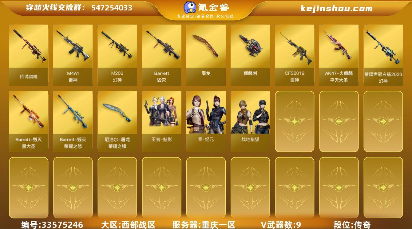 【C6745】重庆一区-10V-0王者武器数-0炫金武器数 【传说武器】:传说幽瞳 【热门武器】:传说幽瞳,M200-幻神 【音效卡】:Barrett-碧霄极光音效卡 【皮肤】:幻神-荣耀世冠白鲨2023 皮肤,M4A1-雷神-CFS 2019,火麒麟-平天大圣,毁灭-荣耀之怒,毁灭-黑大圣皮肤,毁灭-英雄计划 皮肤,屠龙-荣耀之锋 【角色】:零·纪元,战地猎狐,王者-魅影,斗烈龙骑,暗夜-X,芳心审判者,潘多拉-X,潘多拉-甜心教官,蛇姬,铁骑荣耀,新灵狐者 【人偶武器】:Scar Light-马枪,迷你深渊冰龙,夺魂,Barrett-曼陀罗 【暴走生化】:超级对讲机 【英雄级武器】:M4A1-雷神,天罚-斗烈龙驹,Barrett-毁灭,M200-幻神,屠龙,麒麟刺,屠龙-斗烈龙驹 【道具】:女皇终结者-背包,虎牙炫彩背包,女皇终结者-魔龙之吻,救世主-黑桃战神,恶魔剑客-烬使者,夺命之镰,防化服,金色流光-枪王排位*2,流光-鎏金之域,枪王排位29赛季金色流光,电玩兔兔表情,炽雪表情,防弹头盔*2,防弹衣*2,C4工具钳,手雷包 【特殊枪械】: