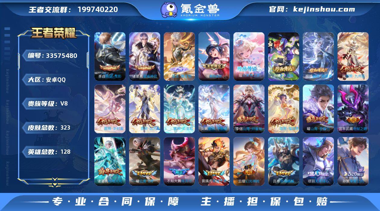 安卓QQ/非凡王者/323皮肤/128英雄/2典藏/0珍品无双/4无双/4珍品传说/24传说/92史诗/9稀有英雄 【4 珍品传说】沧流箭 伽罗,大耳狗之梦 瑶,时之奇旅 孙策,器灵·落星盏 嫦娥, 【2 典藏皮肤】鸣剑·曳影 李白,星域神启 诸葛亮, 【4 无双皮肤】天机白泽 诸葛亮,无相 孙悟空,真我赫兹 瑶,器灵·螭龙剑 曜, 【24 传说皮肤】启明星使 虞姬,花朝如约 蔡文姬,地狱火 孙悟空,云鹰飞将 曜,神骥·聚万邦 貂蝉,地狱之眼 宫本武藏,时雨天司 诸葛亮,无限倾心 项羽,怒海麟威 吕布,挚爱之约 孙策,绯月行 不知火舞,山海·炽霜斩 李信,山海·苍雷引 曜,千山共赴 干将莫邪,愿照·九州拓 澜,愿照·众生和 妲己,愿照·福禄聚 蔡文姬,神树通天 后羿,幻光神枪 云缨,愿照·山河定 司空震,祥瑞亨通 裴擒虎,愿照·岁时盈 虞姬,愿照·千秋盛 女娲,云诺千山 公孙离, 【92 史诗皮肤】电玩小子 鲁班七号,末日机甲 吕布,白昼王子 嬴政,蔬乡物语 鲁班七号,逐梦之星 马可波罗,紫霞仙子 露娜,高山流水 庄周,天秀·音浪 高渐离,苍穹之光 项羽,妄想食味 姬小满,德古拉伯爵 刘邦,心灵战警 亚瑟,五谷丰年 鬼谷子,无心 元歌,巫礼祀神 少司缘,鬼剑武藏 宫本武藏,百相守梦 黄忠,幻珠鲛人 朵莉亚,星夜王子 白起,锁墨魂 钟馗,线条小狗 周...