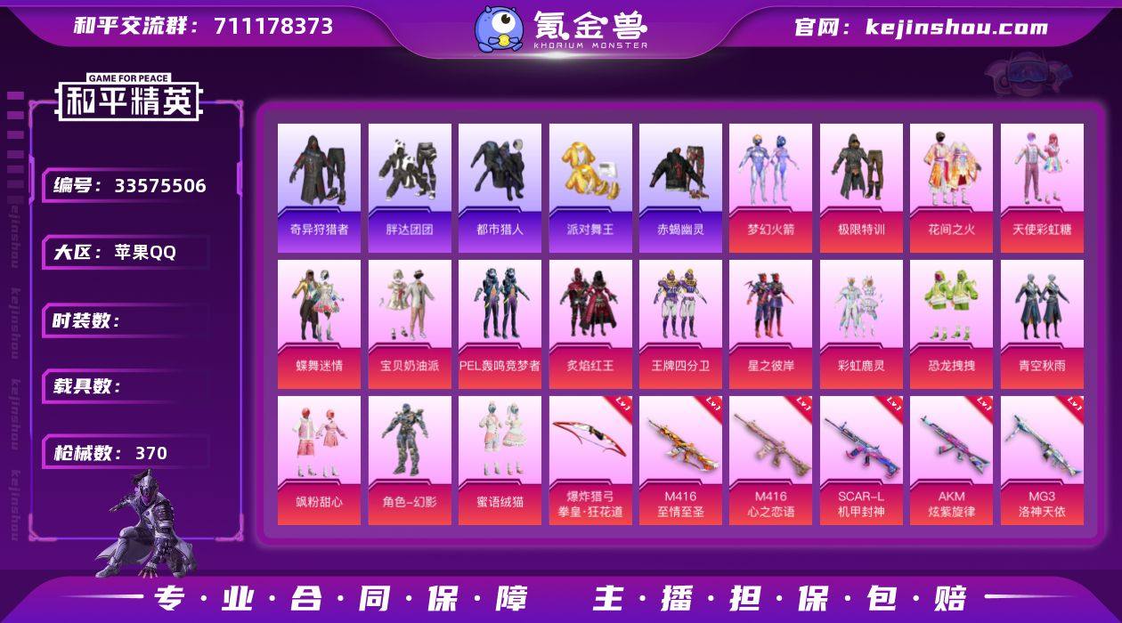 hs69861 苹果手Q-21王牌印记-有战神框-16粉装-15特效枪-热力值-292套装-370枪皮-1卓越印记-1传奇印记 【16粉装】套装-彩虹鹿灵,套装-星之彼岸,套装-王牌四分卫,套装-炙焰红王,套装-宝贝奶油派,套装-极限特训,套装-飒粉甜心,角色-异瞳寒姬,套装-恐龙拽拽,套装-蜜语绒猫,套装-蝶舞迷情,套装-PEL轰鸣竞梦者,套装-花间之火,套装-天使彩虹糖,套装-梦幻火箭,套装-青空秋雨 【15特效枪】DP-28-圣堂之誓/5级,P90-甜蜜草莓/7级,AKS-74U-森灵之息/5级,M416-心之恋语/1级,爆炸猎弓-拳皇·狂花道/5级,DP-28-豹影疾电/5级,AKM-绿萝繁花/5级,ACE32-萌骑漫游/3级,MG3-洛神天依/4级,UMP45-恐龙拽拽/7级,M416-至情至圣/8级,AKM-炫紫旋律/7级,SCAR-L-纯梦嫁纱/7级,SCAR-L-机甲封神/1级,Mk14-福马献瑞/3级 【11稀有紫装】都市猎人,派对舞王,赤蝎幽灵,奇异狩猎者,暗影哥特,雪山精英,浪漫波比,迅捷狂鲨,胖达团团,小丑鱼,龟仙人 【293稀有时装】梦幻火箭,宝贝奶油派,天使彩虹糖,花间之火,蝶舞迷情,极限特训,彩虹鹿灵,飒粉甜心,恐龙拽拽,PEL轰鸣竞梦者,王牌四分卫,蜜语绒猫,异瞳寒姬,炙焰红王,青空秋雨,星之彼岸,迅捷龙虾,SS38特训,都市猎人,胖达团团,奇异狩猎者,龟仙人,雪山精英,暗影哥特,小丑鱼,迅捷...