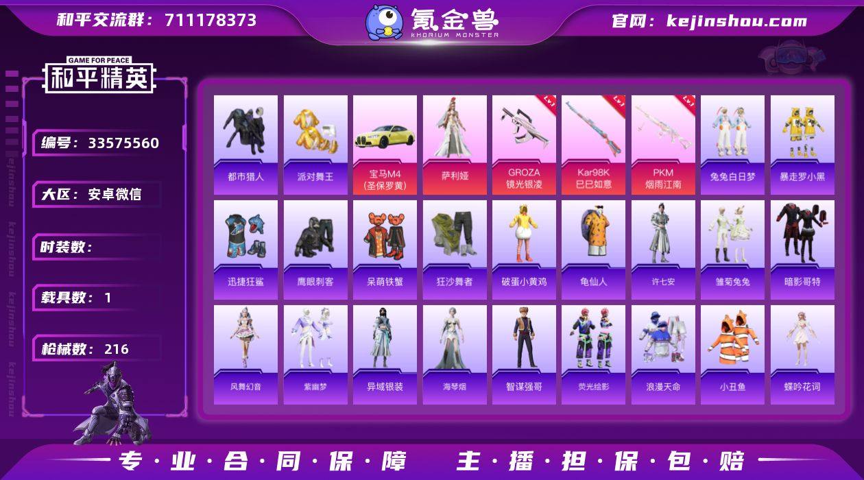 hs68355 安卓微信-9王牌印记-3粉装-8特效枪-1载具-62719热力值-167套装-216枪皮-6卓越印记-2传奇印记 【3粉装】角色-萨利娅,角色-羊梦糖心,角色-千金淑猫 【8特效枪】Mk14-福马献瑞/5级,PKM-江南烟雨/4级,AKS-74U-森灵之息/5级,Kar98K-巳巳如意/5级,DP-28-豹影疾电/5级,GROZA-镜光银凌/5级,M762-青锋波束/5级,AA12-G-萌骑幻想/2级 【8稀有紫装】都市猎人,派对舞王,暗影哥特,浪漫天命,迅捷狂鲨,小丑鱼,龟仙人,许七安 【1稀有载具】宝马M4(圣保罗黄) 【166稀有时装】千金淑猫,羊梦糖心,创世·幻影,萨利娅,迅捷龙虾,SS38特训,都市猎人,浪漫天命,龟仙人,暗影哥特,小丑鱼,迅捷狂鲨,派对舞王,暴走罗小黑,兔兔白日梦,狂沙舞者,萌趣咩咩,荧光绘影,龙魂突击队,小熊娃娃,异域银装,先驱飞行员,白糯汤圆,绒宝小鹅,街头风暴,星途旅人,炽纹蛇影,冰河战士,鱼渊荷华,青团波波,燕燕于飞,海琴烟,战术大师,智谋强哥,紫俏灵猫,许七安,雏菊兔兔,糖糖葫芦,香桃花海,蝶变,巳巳如意,棉花软糖,元素星魂,月烬之祷,琴音绮想,画境星梦,朱霞炽焰,狂鲨锋刃,阳光菠萝,凌霄紫焰,擎苍青焰,炫彩糖果,萌鸡速递,元气之梦,书海巡游,错位像素,漫游都市,顶瓜瓜,雪国风尚,蓝冰羽,恋语绒绒,青翼流星,紫幽梦,马上来财,风舞...