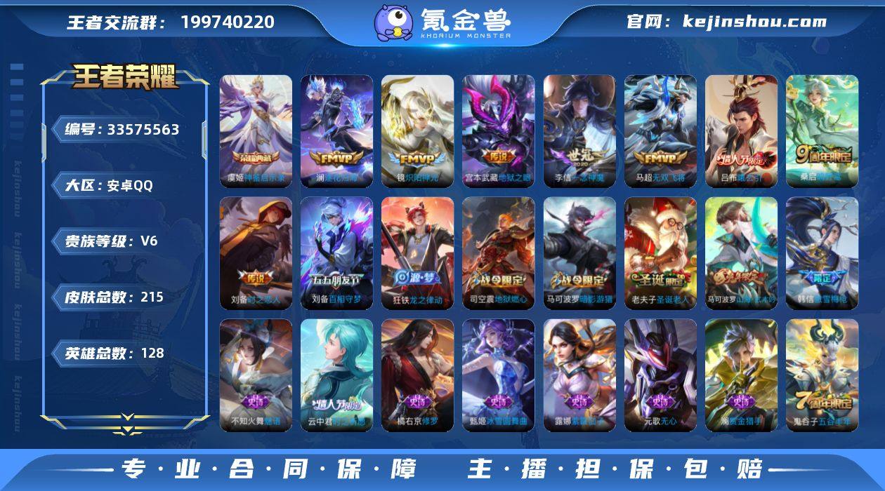 安卓QQ/永恒钻石/215皮肤/128英雄/1典藏/0珍品无双/0无双/0珍品传说/10传说/66史诗/8稀有英雄 【1 典藏皮肤】神鉴启示录 虞姬, 【10 传说皮肤】逐花归海 澜,无双飞将 马超,神骥·赴朔漠 狄仁杰,神骥·逐星野 马超,地狱之眼 宫本武藏,炽阳神光 镜,曦玄引 吕布,时之恋人 刘备,一念神魔 李信,鸣野蒿 桑启, 【66 史诗皮肤】蔬乡物语 鲁班七号,紫霞仙子 露娜,百解令 蒙犽,暗影游猎 马可波罗,燃音魔法 高渐离,天秀·启明 杨戬,德古拉伯爵 刘邦,山海·玄木吟 马可波罗,心灵战警 亚瑟,五谷丰年 鬼谷子,诗语江南 西施,无心 元歌,鬼剑武藏 宫本武藏,百相守梦 黄忠,星夜王子 白起,无限星赏官 公孙离,地狱燃心 司空震,线条小狗 周瑜,顽趣 梦奇,修罗 橘右京,黄金分割率 诸葛亮,偶像歌手 王昭君,荣光圣徽 蒙恬,女仆咖啡 妲己,赏金猎手 澜,星界游侠 暃,鹰眼统帅 狄仁杰,纤云弄巧 云中君,金属风暴 墨子,傲雪梅枪 韩信,特工魅影 百里守约,猫狗日记 孙策,原初追逐者 百里玄策,奇幻香踪 扁鹊,时之祈愿 云中君,未来纪元 赵云,驭风魔法 戈娅,魔术师 狄仁杰,热力回旋 百里玄策,龙之律动 狂铁,皇家上将 赵云,功夫厨神 程咬金,梁祝 上官婉儿,电玩·爆裂旋风 刘禅,天才门将 刘禅,圣诞恋歌 貂蝉,水晶猎龙者 花...