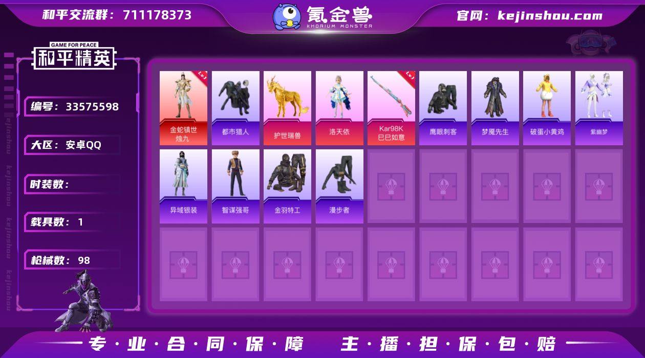 hs69795 安卓手Q-3王牌印记-1红装-1粉装-2特效枪-1载具-26711热力值-61套装-98枪皮 【1红装】金蛇镇世-烛九/3级 【1粉装】角色-洛天依 【2特效枪】DP-28-豹影疾电/5级,Kar98K-巳巳如意/5级 【2稀有紫装】都市猎人,金羽特工 【1稀有载具】护世瑞兽 【60稀有时装】烛九/3级,洛天依,迅捷龙虾,SS38特训,都市猎人,金羽特工,申公豹,异域银装,街头风暴,鱼渊荷华,大橘大利,燕燕于飞,战术大师,智谋强哥,巳巳如意,粉恋花,琴音绮想,画境星梦,朱霞炽焰,狂鲨锋刃,凌霄紫焰,萌鸡速递,元气之梦,雪国风尚,蓝冰羽,恋语绒绒,青翼流星,紫幽梦,樱梦幻音,SS31特训,SS33特训,SS32特训,SS36特训,潮流炫酷,SS37特训,特训学院,绯格组合,漫步者,黑色伏地魔,SS34特训,竞技名士,SS30特训,长空猛禽,旭日情侣,狙击之神,鹰眼刺客,冰冻风暴,完美偶像,梦魇先生,破蛋小黄鸡,森林游猎者,SS21特训,缤纷果语,香榭午后,吉莉礼服,王牌教练,柠萌假日,SS24特训,鹤鸣,SS25特训 【98稀有枪械】Kar98K-巳巳如意/5级,DP-28-豹影疾电/5级,Win94-乌木金纹,12-乌木金纹,S12K-极意拳锋,PKM-紫幽梦,ACE32-画境星梦,M1加兰德-画境星梦,MP5K-画境星梦,Mk14-紫幽梦,蜜獾-乌木金纹,S1897-紫幽梦,P92-紫幽梦,蜜獾-绯穹魔姬,SPAS-12-狂...