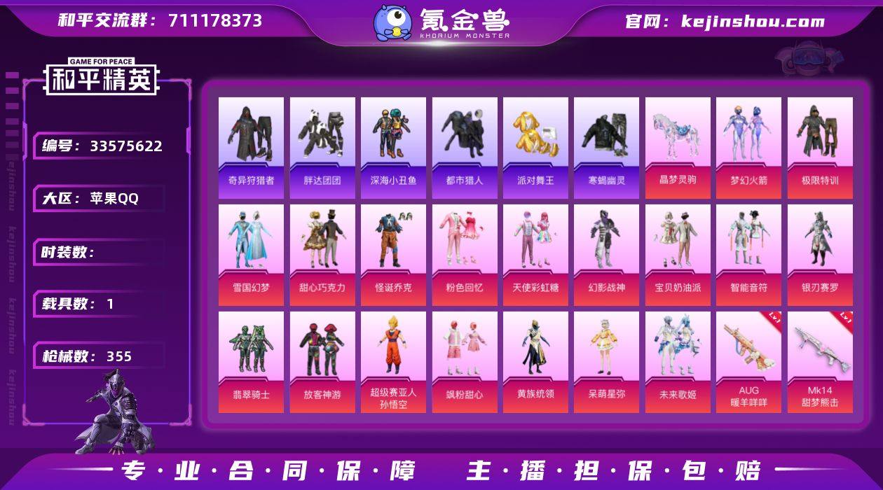 hs68814 苹果手Q-26王牌印记-有战神框-19粉装-13特效枪-1载具-热力值-295套装-355枪皮-1卓越印记 【19粉装】套装-甜心巧克力,套装-智能音符,套装-雪国幻梦,套装-飒粉甜心,套装-黄族统领,套装-银刃赛罗,套装-怪诞乔克,套装-天使彩虹糖,套装-宝贝奶油派,套装-粉色回忆,套装-极限特训,套装-未来歌姬,套装-星穹咏叹调,角色-呆萌星弥,套装-梦幻火箭,套装-幻影战神,套装-极意拳锋,套装-放客神游,套装-翡翠骑士 【13特效枪】AUG-暖羊咩咩/5级,Vector-环太平洋/4级,ACE32-萌骑漫游/3级,AKM-甜心宝贝/6级,破片手榴弹-美味星星糖/7级,MG-36-沧焰双生/5级,Mk14-甜梦熊击/5级,Mk14-福马献瑞/1级,SCAR-L-魔童闹海 哪吒/3级,M416-至情至圣/9级,Kar98K-巳巳如意/5级,DP-28-豹影疾电/5级,M762-激战未来/7级 【11稀有紫装】都市猎人,派对舞王,寒蝎幽灵,奇异狩猎者,深海小丑鱼,浪漫天命,雪山精英,迅捷狂鲨,胖达团团,小丑鱼,龟仙人 【1稀有载具】晶梦灵驹 【291稀有时装】雪国幻梦,甜心巧克力,梦幻火箭,怪诞乔克,放客神游,宝贝奶油派,天使彩虹糖,智能音符,极限特训,幻影战神,黄族统领,飒粉甜心,星穹咏叹调,银刃赛罗,翡翠骑士,未来歌姬,极意拳锋,粉色回忆,呆萌星弥,迅捷龙虾,SS38特训,都市猎人,胖...