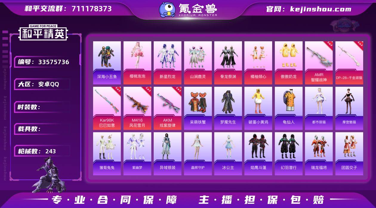 hs69868 安卓手Q-12王牌印记-9粉装-9特效枪-71499热力值-138套装-243枪皮-2卓越印记-1传奇印记 【9粉装】套装-傲傲奶龙,角色-水中影,套装-新星烈龙,套装-骨龙祭渊,角色-绯穹魔姬,套装-橘柚倾心,角色-异瞳寒姬,角色-樱桃泡泡,套装-山涧鹿灵 【9特效枪】MG-36-沧焰双生/5级,M416-风花雪月/7级,AMR-智耀战神/6级,Kar98K-巳巳如意/5级,UMP45-萌骑冒险/3级,DP-28-千金淑猫/6级,DP-28-豹影疾电/5级,Mk14-福马献瑞/5级,AKM-炫紫旋律/7级 【2稀有紫装】深海小丑鱼,龟仙人 【137稀有时装】新星烈龙,樱桃泡泡,水中影,绯穹魔姬,傲傲奶龙,橘柚倾心,异瞳寒姬,山涧鹿灵,骨龙祭渊,迅捷龙虾,SS38特训,龟仙人,深海小丑鱼,萌趣咩咩,异域银装,都市丽猫,摩登魅猫,街头风暴,星途旅人,鱼渊荷华,青团波波,大橘大利,燕燕于飞,战术大师,雏菊兔兔,马上有钱,糖糖葫芦,晶辉守护,巳巳如意,午间小调,彩虹兔,霓虹热舞,雪绒豹,朱霞炽焰,懒羊羊,美羊羊,凌霄紫焰,擎苍青焰,萌鸡速递,元气之梦,风迹短诗,蜜露汐语,薄荷星砂,云朵鹅,冰公主,雪国风尚,蓝冰羽,恋语绒绒,青翼流星,紫幽梦,SS35特训,萝兰蝴蝶,SS31特训,SS33特训,SS32特训,明鸳圣池,SS36特训,贝斯之夜,焰鹰斗篷,暗夜傀儡,英勇保护者,粉彩缠枝,夏日音浪,龙的...