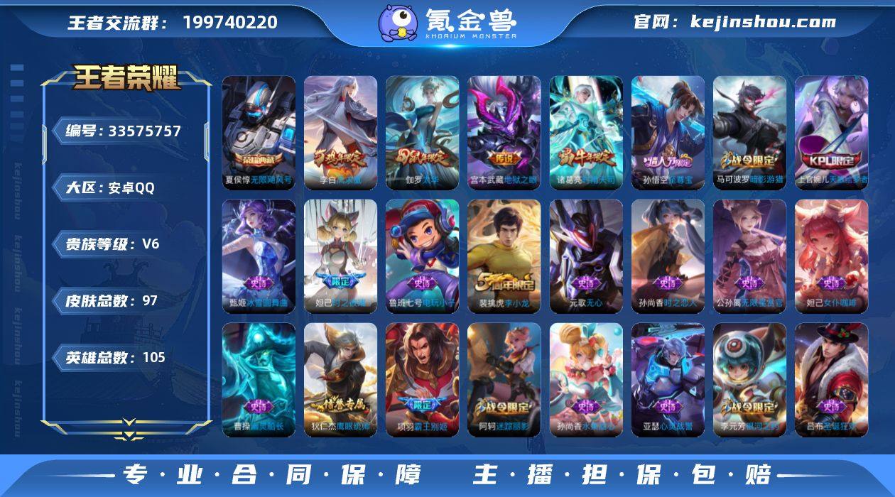 安卓QQ/无双王者/97皮肤/105英雄/1典藏/0珍品无双/0无双/0珍品传说/5传说/29史诗/8稀有英雄 【1 典藏皮肤】无限飓风号 夏侯惇, 【5 传说皮肤】凤求凰 李白,神骥·逐星野 马超,地狱之眼 宫本武藏,时雨天司 诸葛亮,太华 伽罗, 【29 史诗皮肤】霸王别姬 项羽,电玩小子 鲁班七号,银河之约 李元芳,暗影游猎 马可波罗,心灵战警 亚瑟,无心 元歌,迷踪丽影 阿轲,无限星赏官 公孙离,线条小狗 周瑜,魅力维加斯 妲己,偶像歌手 王昭君,女仆咖啡 妲己,鹰眼统帅 狄仁杰,李小龙 裴擒虎,逐浪之夏 李元芳,时之彼端 妲己,优雅恋人 嬴政,魔术师 狄仁杰,皇家上将 赵云,冰冠公主 雅典娜,至尊宝 孙悟空,天才门将 刘禅,圣诞狂欢 吕布,天狼绘梦者 上官婉儿,冰雪圆舞曲 甄姬,缤纷独角兽 小乔,时之恋人 孙尚香,水果甜心 孙尚香,幽灵船长 曹操, 【41 勇者皮肤】圆桌骑士 盾山,沙漠行僧 达摩,大漠名商 沈梦溪,朔风刀 夏侯惇,醍醐杖 老夫子,归虚梦演 孙膑,白色死神 白起,黄金武士 典韦,夺宝奇兵 刘邦,阴阳师 狄仁杰,径山谋武 孙权,鲨炮海盗猫 沈梦溪,海滩派对 项羽,万华元夜 狄仁杰,演武夺筹 程咬金,红桃皇后 芈月,守护之力 大乔,原初探秘者 鬼谷子,星空之诺 沈梦溪,西部大镖客 猪八戒,疑决卦 明世隐,五福同心...