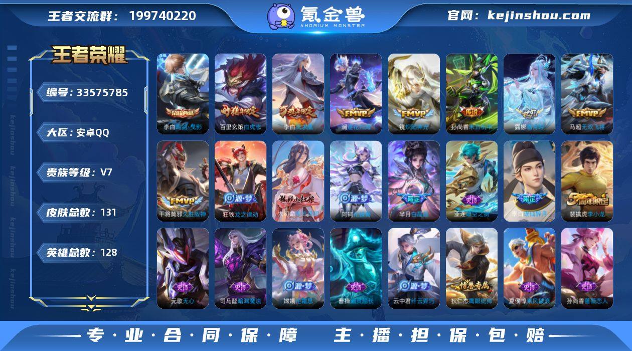安卓QQ/永恒钻石/131皮肤/128英雄/1典藏/0珍品无双/0无双/1珍品传说/12传说/43史诗/8稀有英雄 【1 珍品传说】沧流箭 伽罗, 【1 典藏皮肤】鸣剑·曳影 李白, 【12 传说皮肤】逐花归海 澜,无双飞将 马超,白虎志 百里玄策,死亡执政官 大司命,凤求凰 李白,神骥·逐星野 马超,神骥·越千峰 云缨,炽阳神光 镜,霜月吟 露娜,久胜战神 干将莫邪,末日机甲 孙尚香,神树通天 后羿, 【43 史诗皮肤】百解令 蒙犽,暗渊魔法 司马懿,苍穹之光 项羽,天秀·启明 杨戬,无心 元歌,鬼剑武藏 宫本武藏,百相守梦 黄忠,星夜王子 白起,线条小狗 周瑜,拒霜思 嫦娥,黄金分割率 诸葛亮,滕王阁序 弈星,偶像歌手 王昭君,九幽镇关 项羽,鹰眼统帅 狄仁杰,白晶晶 芈月,李小龙 裴擒虎,光弋星穹 莱西奥,纤云弄巧 云中君,金属风暴 墨子,特工魅影 百里守约,原初追逐者 百里玄策,魔术师 狄仁杰,热力回旋 百里玄策,龙之律动 狂铁,皇家上将 赵云,冰冠公主 雅典娜,东方月初 大司命,涂山容容 公孙离,破空之剑 亚连,怒海争锋 黄忠,蔷薇恋人 孙尚香,月团寄思 沈梦溪,节奏热浪 阿轲,谪仙醉月 李白,绅士熊喵 刘禅,缤纷独角兽 小乔,线条小狗 小乔,水果甜心 孙尚香,化蝶舞 阿轲,幽灵船长 曹操,乘风破浪 夏侯惇,暗隐猎兽者 兰陵王, 【...