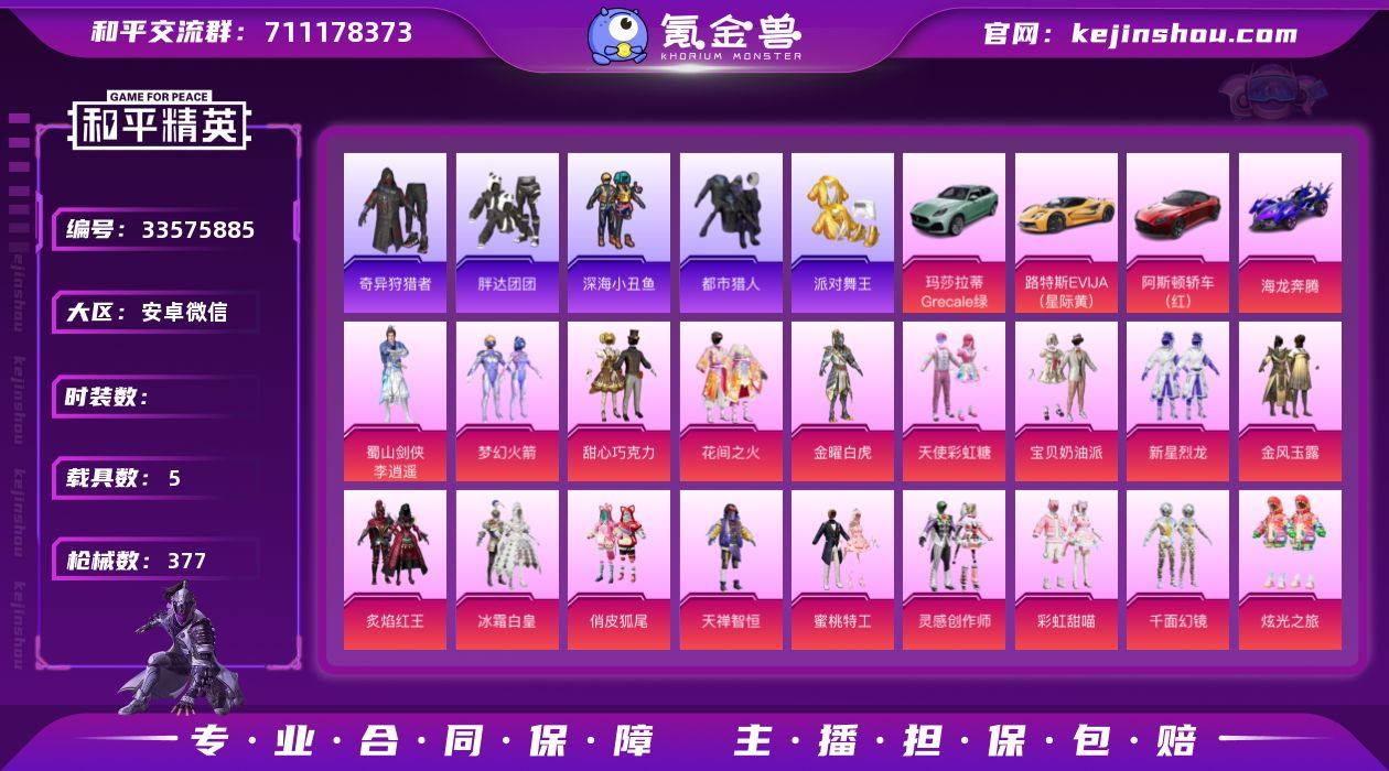 hs64536 安卓微信-27王牌印记-有战神框-21粉装-13特效枪-5载具-热力值-327套装-377枪皮-5卓越印记-2传奇印记 【21粉装】套装-俏皮狐尾,套装-天禅智恒,套装-灵感创作师,套装-千面幻镜,套装-天使彩虹糖,套装-星穹咏叹调,套装-暗夜玫瑰,套装-蜜桃特工,角色-初号机款机体服,套装-炙焰红王,套装-宝贝奶油派,套装-金风玉露,套装-彩虹甜喵,套装-甜心巧克力,套装-梦幻火箭,套装-炫光之旅,套装-金曜白虎,套装-新星烈龙,套装-花间之火,蜀山剑侠-李逍遥,套装-冰霜白皇 【13特效枪】M249-彩虹甜喵/6级,AKM-甜心宝贝/7级,Kar98K-巳巳如意/5级,M416-至情至圣/9级,UMP45-相思残雪/5级,M416-五爪金龙/1级,AKS-74U-森灵之息/5级,M416-心之恋语/1级,SCAR-L-锦绣绵绵/5级,SCAR-L-青春物语/7级,AUG-星之彼岸/3级,Mk14-福马献瑞/4级,GROZA-镜光银凌/5级 【16稀有紫装】都市猎人,派对舞王,萌熊伴侣背包(3级),奇异狩猎者,暗影哥特,深海小丑鱼,浪漫天命,雪山精英,迅捷狂鲨,胖达团团,明日香款战斗服,小丑鱼,龟仙人,金羽特工,真嗣款战斗服,东方飞龙 【5稀有载具】保时捷911 敞篷版(星珀红),阿斯顿·马丁DBS(红),玛莎拉蒂Grecale(薄荷绿),路特斯EVIJA(星际黄),海龙奔腾 【327稀有时装】梦幻火箭,初号机款机...