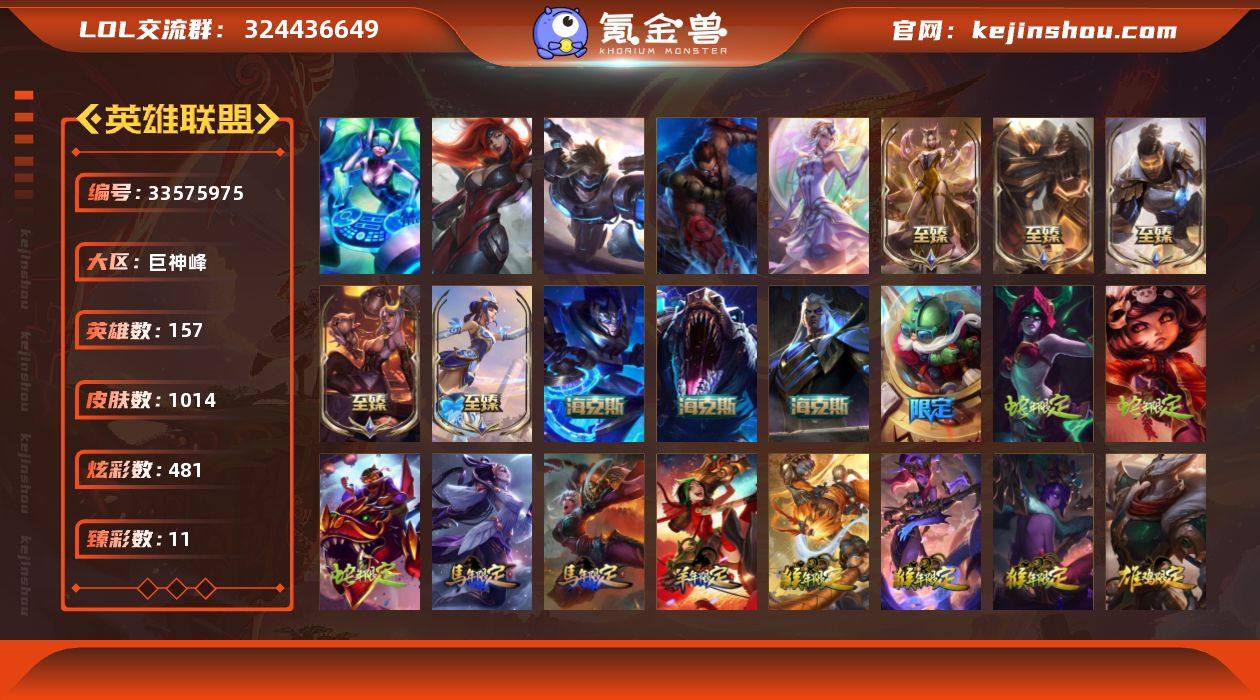 t40084【巨神峰】红龙瞎 1014皮肤 481炫彩 11臻彩 8神话/196限定/90传说/157英雄 账号等级:45 【重要头像】女巫头 爱意绵绵 爱情之歌 心型钥匙 觅心游侠卢锡安 觅心之翼奎因 雪花 击拳 救生圈 沐浴震惊 至臻青花瓷拉克丝 【重要皮肤】机神玄武盖伦至臻 青花瓷拉克丝至臻 未来战士卢锡安至臻 KDA阿狸至臻 烈焰美人薇恩至臻 海克斯科技雷克顿 海克斯科技斯维因 海克斯科技嘉文四世 哥特萝莉安妮 冰原核弹古拉加斯 舞会公主安妮 战熊骑士瑟庄妮 创星之灵璐璐 养蜂人辛吉德 电玩女神厄运小姐 电玩勇者锐雯 电玩女神阿狸 玉剑传说舞剑仙 灵能特工易 龙的传人李青 银龙裁决泰隆 替父从军花木兰 神龙烈焰金克丝 碧玉之牙卡西奥佩娅 春晖神女拉克丝 你看见过我的熊猫吗安妮 北辰之威内瑟斯 南天之怒沃里克 美猴王孙悟空 定海神珍孙悟空 玉净夜叉凯特琳 紫金罗刹莫甘娜 广寒仙子嫦娥 虎痴之拳蔚 张辽文远 司马懿仲达 金猪烈焰瑟庄妮 烈焰美人薇恩 纳财大帝塔姆 神龙之翼库奇 碎心之拳蔚 甜心之羽霞 甜心之翎洛 甜心宝贝安妮 甜心宝贝娑娜 穿心之剑菲奥娜 觅心游侠卢锡安 觅心魔灵奥莉安娜 觅心女王艾希 觅心之翼奎因 觅...