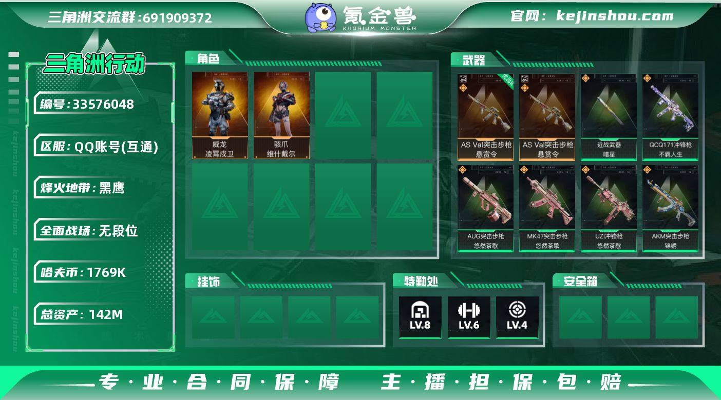 【sjs11054】包人脸 玩够能回血 2红皮1刀皮1典藏 sjs11054 142m总资产-1769k哈夫币-60烽火等级-黑鹰-5战场等级-无军衔 【干员外观】:骇爪-维什戴尔,威龙-凌霄戍卫 【近战皮肤】:近战-暗星,近战-黑鹰 【典藏外观】:AS Val突击步枪-悬赏令 【典藏外观成色】:AS Val突击步枪-悬赏令(优品B) 【传说外观】:AKM突击步枪-锦绣,QBZ95-1突击步枪-凌霄戍卫,ASh-12战斗步枪-鹅鸭杀,AUG突击步枪-悠然茶歇,SCAR-H战斗步枪-启航,K437突击步枪-锦绣,MK47突击步枪-悠然茶歇,MK47突击步枪-暗星,UZI冲锋枪-悠然茶歇,SMG-45冲锋枪-锦绣,SR-3M紧凑突击步枪-暗星,QCQ171冲锋枪-鹅鸭杀,QCQ171冲锋枪-不羁人生,QJB201轻机枪-鹅鸭杀,R93狙击步枪-维什戴尔 【史诗外观】:K416突击步枪-冬日风情,SG552突击步枪-哈夫克警备,MP5冲锋枪-战术竞备,MP5冲锋枪-竞技风,Vector冲锋枪-猎鳄行动,SR-3M紧凑突击步枪-战术竞备,勇士冲锋枪-工业狂潮,MP7冲锋枪-六套之力,S12K霰弹枪-曙光,M250通用机枪-囚徒,QJB201轻机枪-炽焰,SVD狙击步枪-阿萨拉工艺, M14射手步枪-航天庆典 【稀有外观】:AKM突击步枪-肃杀,QBZ95-1突击步枪-公平竞技,M7战斗步枪-捣蛋鬼,SG552突击步枪-贴花艺...