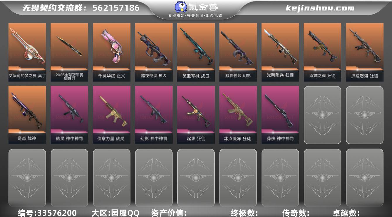 【sf611】【套装】:2025全球冠军赛套装,VCT 2025 赛季套装,黯夜怪谈套装,神中神罚套装 【英雄】:幻棱,炼狱,维斯,暮蝶,钛狐,壹决,铁臂,捷风,不死鸟,贤者,猎枭,蝰蛇,零,芮娜,奇乐,尚勃勒,霓虹,K/O,海神,盖可,黑梦,钢锁 【近战武器】:近战武器-2025全球冠军赛 蝴蝶刀,近战武器-神之刃,近战武器-奇点//2.0 蝴蝶刀,近战武器-VCT 2025 爪刀,近战武器-威龙之刃,近战武器-超能偶像 应援棒,近战武器-超限闪存 匕首,近战武器-荒土机兵 热能刀,近战武器-夜刃诡镰,近战武器-诡秘蛇影 军刀 【狂徒】:狂徒-2025全球冠军赛,狂徒-光明哨兵,狂徒-洪荒怒焰,狂徒-双城之战,狂徒-创·纪元,狂徒-冰点凝冻,狂徒-起源,狂徒-超能偶像,狂徒-荒土机兵,狂徒-巨神铁甲,狂徒-诡秘蛇影 【幻影】:幻影-黯夜怪谈,幻影-异鳞魔蛇,幻影-神中神罚,幻影-超限闪存,幻影-聚合之力,幻影-纳米打击,幻影-末日之翼 【戍卫】:戍卫-破败军械,戍卫-超能偶像,戍卫-浮光跃金,戍卫-逆冲蛮牛,戍卫-折光棱晶 【獠犬】:獠犬-黯夜怪谈,獠犬-采蜜小蜂队,獠犬-模拟赫兹,獠犬-逆冲蛮牛 【冥驹】:冥驹-荒土机兵,冥驹-模拟赫兹 【飞将】:飞将-黯夜怪谈,飞将-聚合之力...