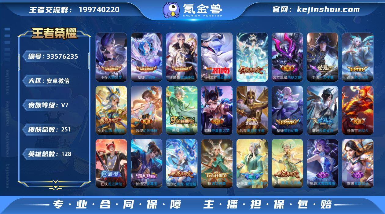 安卓微信/绝世王者/251皮肤/128英雄/3典藏/0珍品无双/1无双/1珍品传说/13传说/71史诗/9稀有英雄 【1 珍品传说】怪盗基德 马可波罗, 【3 典藏皮肤】天鹅之梦 小乔,幻阙歌 貂蝉,星域神启 诸葛亮, 【1 无双皮肤】无相 孙悟空, 【13 传说皮肤】云霓雀翎 虞姬,地狱火 孙悟空,游龙清影 西施,猫影幻舞 貂蝉,仲夏夜之梦 貂蝉,地狱之眼 宫本武藏,黄金射手座 后羿,一念神魔 李信,山海·琳琅生 小乔,愿照·众生和 妲己,神树通天 后羿,幻光神枪 云缨,鸣野蒿 桑启, 【71 史诗皮肤】末日机甲 吕布,白昼王子 嬴政,紫霞仙子 露娜,百解令 蒙犽,乘龙·忆丹青 大乔,燃音魔法 高渐离,天秀·启明 杨戬,德古拉伯爵 刘邦,无心 元歌,巫礼祀神 少司缘,鬼剑武藏 宫本武藏,星夜王子 白起,锁墨魂 钟馗,线条小狗 周瑜,百晓客 明世隐,摇滚巨星 嬴政,顽趣 梦奇,拒霜思 嫦娥,魅力维加斯 妲己,黄金分割率 诸葛亮,偶像歌手 王昭君,女仆咖啡 妲己,遇见神鹿 瑶,舞动绿茵 蔡文姬,繁星吟游 蔡文姬,暗夜贵公子 嬴政,鹰眼统帅 狄仁杰,光弋星穹 莱西奥,奇迹圣诞 蔡文姬,金属风暴 墨子,特工魅影 百里守约,猫狗日记 孙策,逐浪之夏 李元芳,奇幻香踪 扁鹊,优雅恋人 嬴政,驭风魔法 戈娅,魔术师 狄仁杰,龙之律动 狂铁,唤灵魅影 貂...