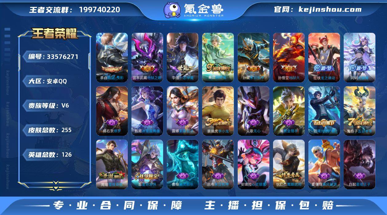 安卓QQ/非凡王者/255皮肤/126英雄/1典藏/0珍品无双/0无双/0珍品传说/7传说/58史诗/7稀有英雄 【1 典藏皮肤】鸣剑·曳影 李白, 【7 传说皮肤】地狱火 孙悟空,地狱之眼 宫本武藏,神骥·镇沧海 关羽,末日机甲 孙策,一念神魔 李信,神树通天 后羿,鸣野蒿 桑启, 【58 史诗皮肤】末日机甲 吕布,紫霞仙子 露娜,百解令 蒙犽,高山流水 庄周,雪夜绮愿 周瑜,天秀·启明 杨戬,猫狗日记 大乔,心灵战警 亚瑟,五谷丰年 鬼谷子,无心 元歌,巫礼祀神 少司缘,鬼剑武藏 宫本武藏,百相守梦 黄忠,星夜王子 白起,线条小狗 周瑜,遇见飞天 杨玉环,顽趣 梦奇,修罗 橘右京,魅力维加斯 妲己,偶像歌手 王昭君,荣光圣徽 蒙恬,赏金猎手 澜,九幽镇关 项羽,星界游侠 暃,鹰眼统帅 狄仁杰,李小龙 裴擒虎,光弋星穹 莱西奥,金属风暴 墨子,特工魅影 百里守约,逐浪之夏 李元芳,未来纪元 赵云,黎明之约 雅典娜,魔术师 狄仁杰,龙之律动 狂铁,皇家上将 赵云,冰冠公主 雅典娜,功夫厨神 程咬金,梁祝 上官婉儿,天才门将 刘禅,圣诞恋歌 貂蝉,圣诞狂欢 吕布,星界战将 牛魔,冰雪圆舞曲 甄姬,节奏热浪 阿轲,游园惊梦 甄姬,曙光守护者 铠,万灵启世 女娲,心灵骇客 安琪拉,箭羽风息 伽罗,百相守梦 周瑜,万物之道 弈星,线条小狗 小乔,水...