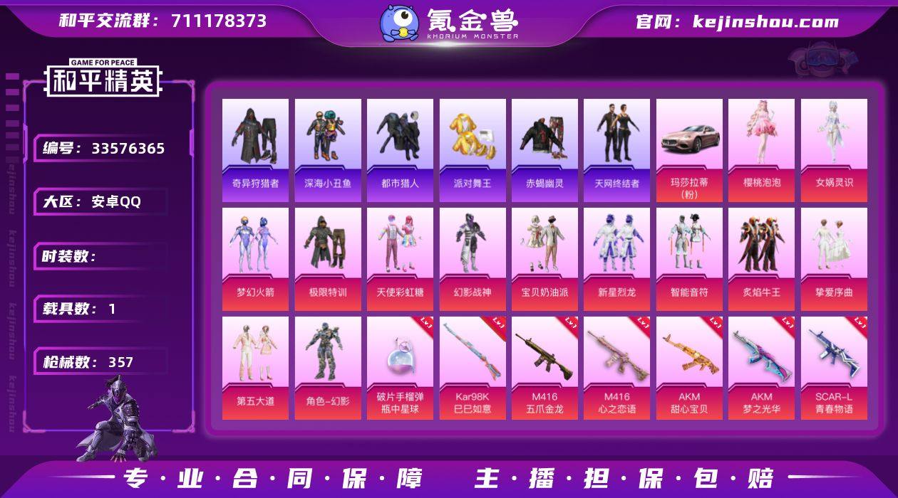 hs67202 安卓手Q-25王牌印记-14粉装-13特效枪-1载具-热力值-255套装-357枪皮-3卓越印记 【14粉装】人物-小舞·恋语,角色-女娲灵识,套装-第五大道,套装-梦幻火箭,套装-宝贝奶油派,角色-绯穹魔姬,套装-智能音符,套装-极限特训,套装-天使彩虹糖,角色-樱桃泡泡,套装-挚爱序曲,套装-炙焰牛王,套装-幻影战神,套装-新星烈龙 【13特效枪】Mk14-福马献瑞/5级,DP-28-豹影疾电/5级,AKS-74U-森灵之息/5级,M416-五爪金龙/6级,ACE32-萌骑漫游/2级,Kar98K-巳巳如意/5级,UMP45-萌骑冒险/3级,AKM-梦之光华/4级,AUG-超新星/6级,M416-心之恋语/7级,AKM-甜心宝贝/7级,SCAR-L-青春物语/6级,破片手榴弹-瓶中星球/7级 【14稀有紫装】都市猎人,Mark.06,派对舞王,赤蝎幽灵,天网终结者,奇异狩猎者,暗影哥特,深海小丑鱼,浪漫天命,迅捷狂鲨,小丑鱼,龟仙人,萌熊伴侣背包(3级),真理款战斗服 【1稀有载具】玛莎拉蒂Ghibli(粉) 【255稀有时装】梦幻火箭,第五大道,新星烈龙,宝贝奶油派,天使彩虹糖,智能音符,极限特训,小舞·恋语,樱桃泡泡,女娲灵识,幻影战神,绯穹魔姬,炙焰牛王,挚爱序曲,都市猎人,浪漫天命,奇异狩猎者,龟仙人,Mark.06,暗影哥特,深海小丑鱼,小丑鱼,迅捷狂鲨,赤蝎幽灵,派对舞王,天网终结者,奇趣企鹅,...