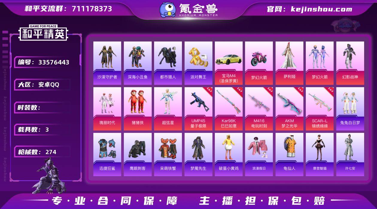 hs69997 安卓手Q-15王牌印记-8粉装-10特效枪-3载具-85984热力值-209套装-274枪皮-6卓越印记-1传奇印记 【8粉装】角色-萨利娅,套装-星穹咏叹调,角色-超弦星,套装-瑰丽时代,套装-幻影战神,角色-异瞳寒姬,玩偶服-猪猪侠,套装-梦幻火箭 【10特效枪】UMP45-量子极限/5级,Mk14-福马献瑞/5级,MG-36-沧焰双生/5级,M416-电玩时刻/5级,AA12-G-萌骑幻想/4级,AKS-74U-森灵之息/5级,DP-28-豹影疾电/5级,AKM-梦之光华/7级,Kar98K-巳巳如意/5级,SCAR-L-锦绣绵绵/5级 【11稀有紫装】都市猎人,Mark.06,派对舞王,沙漠守护者,暗影哥特,深海小丑鱼,浪漫天命,迅捷狂鲨,小丑鱼,龟仙人,许七安 【3稀有载具】宝马M4(圣保罗黄),暮色幽蹄,双人摩托-梦幻火箭 【208稀有时装】梦幻火箭,幻影战神,猪猪侠,创世·幻影,星穹咏叹调,异瞳寒姬,萨利娅,瑰丽时代,超弦星,迅捷龙虾,SS38特训,沙漠守护者,都市猎人,浪漫天命,龟仙人,Mark.06,暗影哥特,深海小丑鱼,小丑鱼,迅捷狂鲨,派对舞王,兔兔白日梦,Alan Walker,萌趣咩咩,星河浪客,异域银装,摩登魅猫,白糯汤圆,街头风暴,星途旅人,鱼渊荷华,青团波波,大橘大利,燕燕于飞,NV战队服,战术大师,智谋强哥,紫俏灵猫,许七安,雏菊兔兔,马上有钱,多纳泰罗,糖糖葫芦,香桃花海,蝶变,...