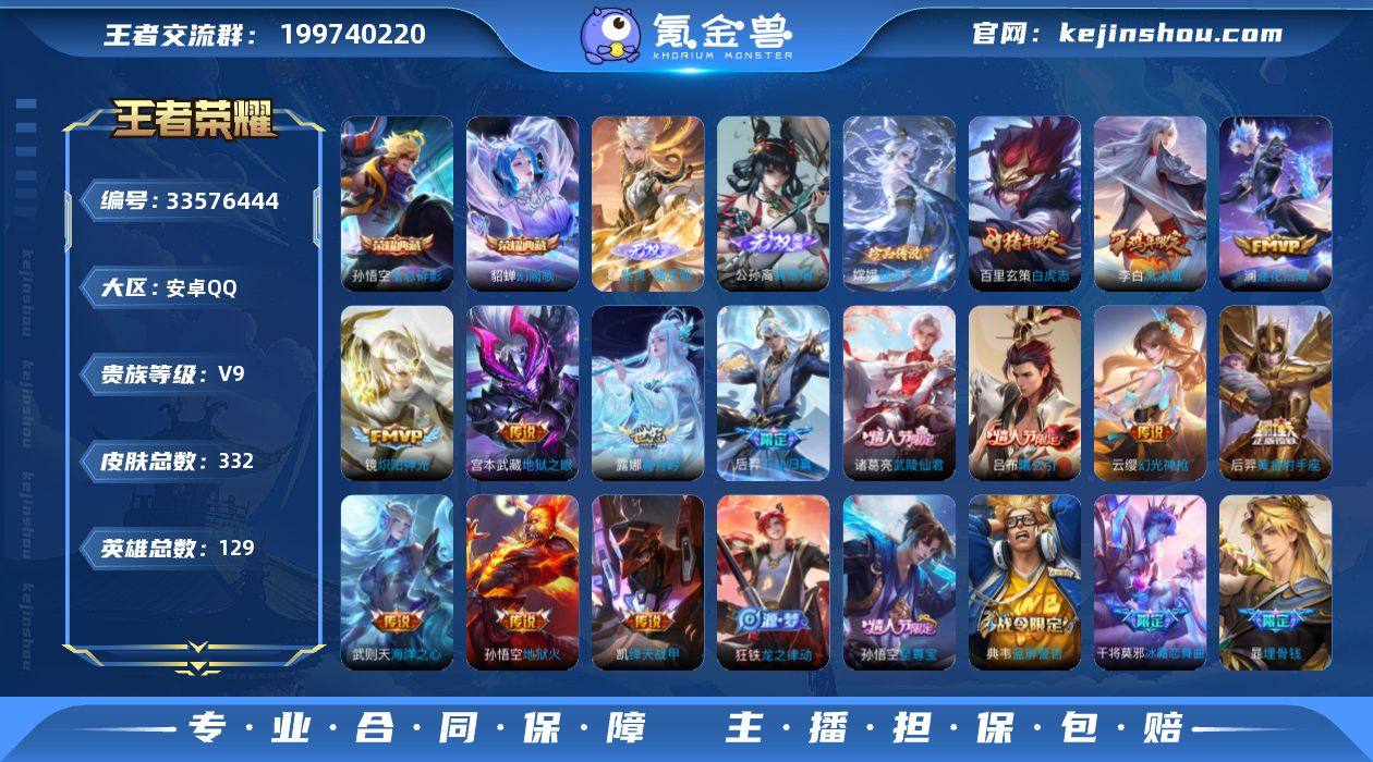 安卓QQ/绝世王者/332皮肤/129英雄/2典藏/0珍品无双/3无双/2珍品传说/24传说/91史诗/10稀有英雄 【2 珍品传说】沧流箭 伽罗,器灵·落星盏 嫦娥, 【2 典藏皮肤】全息碎影 孙悟空,幻阙歌 貂蝉, 【3 无双皮肤】问心剑 李信,离恨烟 公孙离,器灵·螭龙剑 曜, 【24 传说皮肤】启明星使 虞姬,逐花归海 澜,白虎志 百里玄策,地狱火 孙悟空,凤求凰 李白,神骥·赴朔漠 狄仁杰,神骥·鸣幻洲 朵莉亚,神骥·聚万邦 貂蝉,神骥·逐星野 马超,地狱之眼 宫本武藏,神骥·镇沧海 关羽,神骥·越千峰 云缨,武陵仙君 诸葛亮,海洋之心 武则天,炽阳神光 镜,黄金射手座 后羿,曦玄引 吕布,霜月吟 露娜,踏浪归 韩信,绛天战甲 铠,长夜焕生 王昭君,千山共赴 干将莫邪,幻光神枪 云缨,千劫归真 后羿, 【91 史诗皮肤】末日机甲 吕布,白昼王子 嬴政,紫霞仙子 露娜,高山流水 庄周,银河之约 李元芳,冰霜恋舞曲 干将莫邪,苍穹之光 项羽,狮舞东方 鲁班七号,猫狗日记 大乔,妄想食味 姬小满,德古拉伯爵 刘邦,心灵战警 亚瑟,星君·亢金 达摩,五谷丰年 鬼谷子,无心 元歌,巫礼祀神 少司缘,鬼剑武藏 宫本武藏,百相守梦 黄忠,星夜王子 白起,锁墨魂 钟馗,线条小狗 周瑜,百晓客 明世隐,顽趣 梦奇,冰锋战神 关羽,魅力维加斯 妲己,黄金分割...