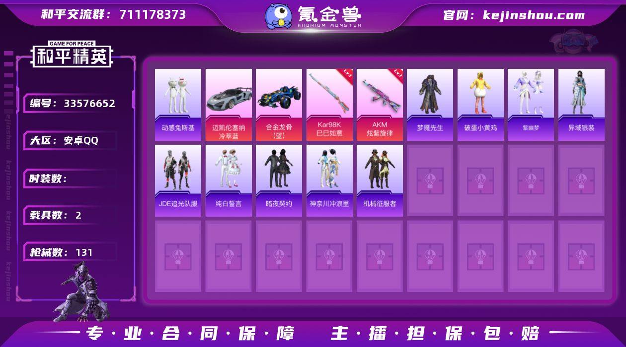 hs62951 安卓手Q-6王牌印记-1粉装-9特效枪-2载具-41894热力值-94套装-131枪皮-4卓越印记 【1粉装】角色-辉云木星 【9特效枪】Kar98K-巳巳如意/5级,蜜獾-异瞳寒姬/4级,DP-28-豹影疾电/5级,ACE32-萌骑漫游/2级,AA12-G-萌骑幻想/4级,Mk14-福马献瑞/5级,UMP45-萌骑冒险/1级,AKS-74U-森灵之息/5级,AKM-炫紫旋律/6级 【2稀有载具】迈凯伦塞纳(冷萃蓝),合金龙骨(蓝) 【91稀有时装】JDG追光队服,SS35特训,午间小调,SS31特训,SS33特训,SS32特训,SS36特训,蓝冰羽,恋语绒绒,星渊小夜曲,SS34特训,紫幽梦,狂鲨锋刃,大橘大利,紫俏灵猫,粉黛兰香,炫彩糖果,萌鸡速递,元气之梦,风迹短诗,秘语星愿,粉恋花,顶瓜瓜,雪国风尚,动感兔斯基人偶服,异域银装,战术大师,机械英豪,机械征服者,暗夜契约,纯白誓言,PEC最牛战神,潮流炫酷,青玉碎影,萌黄之夏,SS37特训,超能拳王,特训学院,猎鹰,青年教官,黄色运动,蓝色运动,黄色伏地魔,白色伏地魔,热血青春,深海格斗者,酷萌兔限定,黑色伏地魔,骑行爱好者,竞技名士,蓝色守护者,深蓝色名流,长空猛禽,神奈川冲浪里,特战装甲,战地菁英,怒火燎原,冷焰舞者,传奇侦探,牛气满满,冰川特警,潮流先锋,燃烧卡路里,狙击之神,红釉青花,雨过天青,福马献瑞,幻影武者,梦魇先生,破...