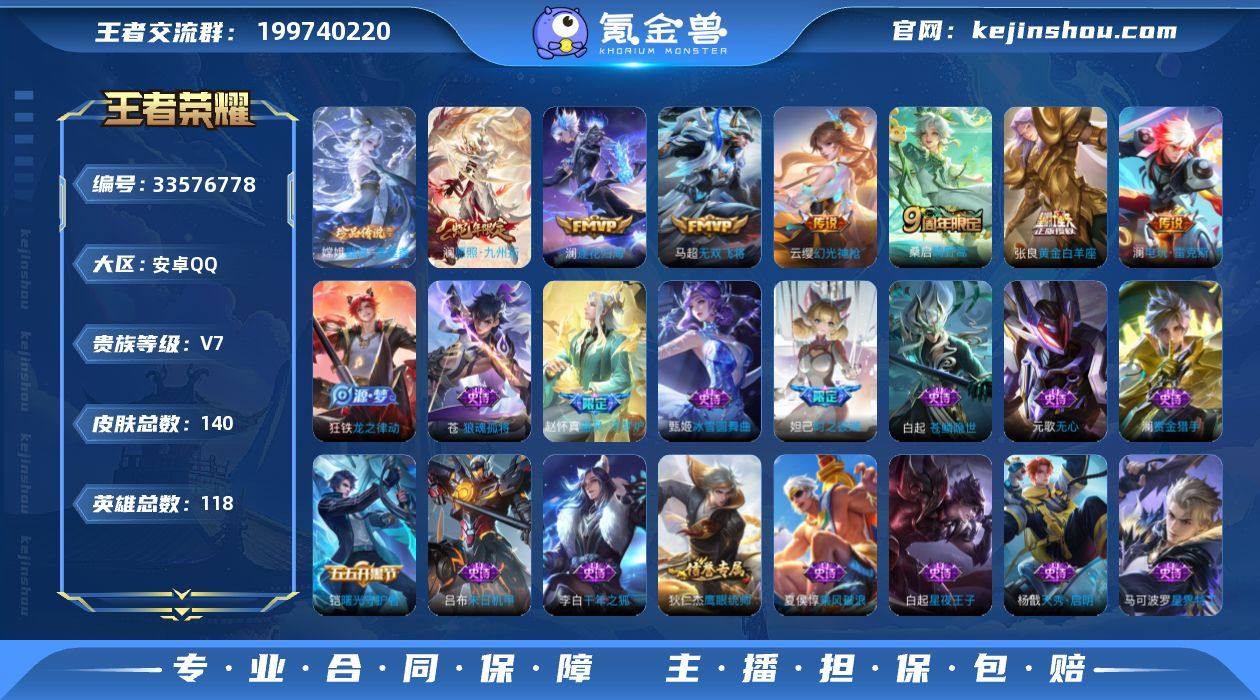 安卓QQ/至尊星耀/140皮肤/118英雄/0典藏/0珍品无双/0无双/2珍品传说/14传说/40史诗/9稀有英雄 【2 珍品传说】沧流箭 伽罗,器灵·落星盏 嫦娥, 【14 传说皮肤】逐花归海 澜,电玩·雷克斯 澜,无双飞将 马超,神骥·赴朔漠 狄仁杰,神骥·鸣幻洲 朵莉亚,神骥·聚万邦 貂蝉,神骥·逐星野 马超,神骥·镇沧海 关羽,神骥·越千峰 云缨,黄金白羊座 张良,愿照·九州拓 澜,神树通天 后羿,幻光神枪 云缨,鸣野蒿 桑启, 【40 史诗皮肤】末日机甲 吕布,天秀·启明 杨戬,无心 元歌,巫礼祀神 少司缘,鬼剑武藏 宫本武藏,百相守梦 黄忠,星夜王子 白起,线条小狗 周瑜,百晓客 明世隐,摇滚巨星 嬴政,苍鳞隐世 白起,偶像歌手 王昭君,赏金猎手 澜,鹰眼统帅 狄仁杰,傩神司 兰陵王,光弋星穹 莱西奥,猫狗日记 孙策,真我赫兹 百里守约,未来纪元 赵云,时之彼端 妲己,石田雨龙 后羿,魔术师 狄仁杰,龙之律动 狂铁,皇家上将 赵云,圣诞恋歌 貂蝉,器灵·浮梦炉 赵怀真,冰雪圆舞曲 甄姬,千年之狐 李白,曙光守护者 铠,万灵启世 女娲,箭羽风息 伽罗,乱世虎臣 张飞,百相守梦 周瑜,万物之道 弈星,星界特工 马可波罗,线条小狗 小乔,水果甜心 孙尚香,狼魂孤将 苍,乘风破浪 夏侯惇,暗隐猎兽者 兰陵王, 【64 勇者皮肤】太极少年 赵怀真...