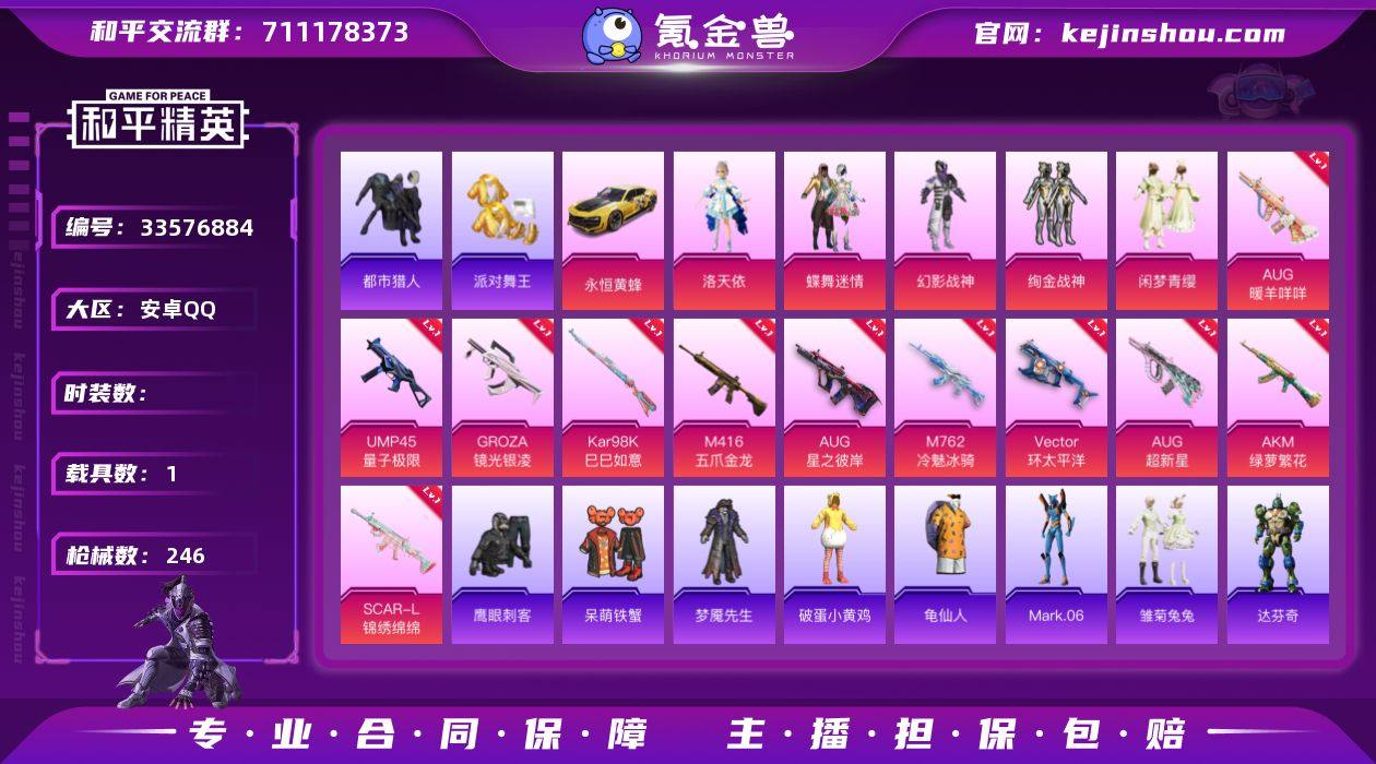 hs68021安卓手Q-15王牌印记-有战神框-6粉装-16特效枪-1载具-76093热力值-160套装-246枪皮-8卓越印记-4传奇印记 【6粉装】套装-闲梦青缨,套装-幻影战神,角色-千金淑猫,角色-洛天依,套装-绚金战神,套装-蝶舞迷情 【16特效枪】UMP45-量子极限/5级,Kar98K-巳巳如意/5级,Vector-环太平洋/7级,AUG-超新星/5级,AUG-星之彼岸/1级,AA12-G-萌骑幻想/2级,M416-五爪金龙/7级,Mk14-福马献瑞/5级,AKM-绿萝繁花/5级,AUG-暖羊咩咩/5级,M762-青锋波束/5级,SCAR-L-锦绣绵绵/5级,DP-28-豹影疾电/5级,AKS-74U-森灵之息/5级,M762-冷魅冰骑/7级,GROZA-镜光银凌/5级 【7稀有紫装】都市猎人,Mark.06,派对舞王,暗影哥特,浪漫天命,小丑鱼,龟仙人 【1稀有载具】永恒黄蜂 【160稀有时装】蝶舞迷情,洛天依,绚金战神,千金淑猫,幻影战神,闲梦青缨,都市猎人,浪漫天命,龟仙人,Mark.06,暗影哥特,小丑鱼,派对舞王,萌趣咩咩,龙魂突击队, 暗影刺翼,异域银装,街头风暴,星途旅人,冰河战士,鱼渊荷华,裁决天象,青团波波,大橘大利,燕燕于飞,海琴烟,达芬奇,战术大师,智谋强哥,紫俏灵猫,雏菊兔兔,马上有钱,糖糖葫芦,晶辉守护,香桃花海,墨青刃影,巳巳如意,粉恋花,午间小调,彩虹兔,琴音绮想,霓虹热舞,雪绒豹,画境星梦,朱霞炽...