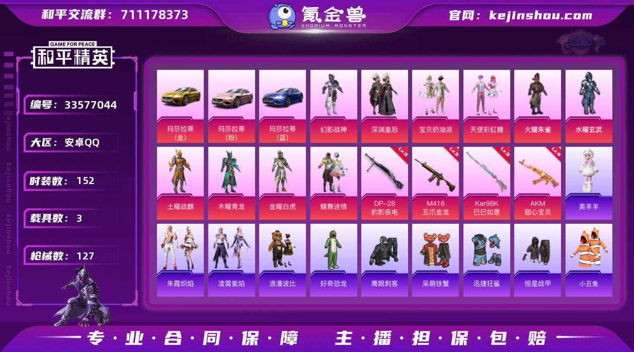 安卓 手Q-10粉装-5特效枪-3载具-2粉色飞行器-50697热力值-4王牌印记-152套装-127枪皮QW2641709 【热门品类】:套装-小丑鱼,套装-忍者信条,套装-浪漫波比,熔岩游骑兵连帽夹克 【粉色套装】:粉装-幻影战神,粉装-深渊皇后,粉装-宝贝奶油派,粉装-天使彩虹糖,粉装-火曜朱雀,粉装-水曜玄武,粉装-土曜战麒,粉装-木曜青龙,粉装-金曜白虎,粉装-蝶舞迷情 【粉色枪皮等级】:AKM-甜心宝贝(四级),M416-五爪金龙(五级),Kar98K-巳巳如意(五级),Mk14-福马献瑞(五级),DP-28-豹影疾电(五级) 【粉色载具】:玛莎拉蒂Ghibli(金),玛莎拉蒂Ghibli(粉),玛莎拉蒂Ghibli(蓝) 【粉色枪皮】:AKM-甜心宝贝,M416-五爪金龙,Kar98K-巳巳如意,Mk14-福马献瑞,DP-28-豹影疾电 【粉色飞行器】:炫彩糖果飞行器 【粉色降落伞】:极限特训降落伞,幻影战神降落伞,凝视深渊降落伞,银河战甲降落伞,甜心宝贝降落伞,春暖花开降落伞,炫彩糖果降落伞 【稀有套装】:套装-炫彩糖果,套装-马上有钱,套装-朱霞炽焰,套装-凌霄紫焰,玩偶服-美羊羊,角色-孙斩天 【稀有枪皮】:AKM-冰凉西瓜,AKM-夜灯,AKM-生命誓言,AKM-破晓战魂,AKM-缤纷海域,M16A4-凝视深渊,M16A4-夜灯,M16A4-蓝...