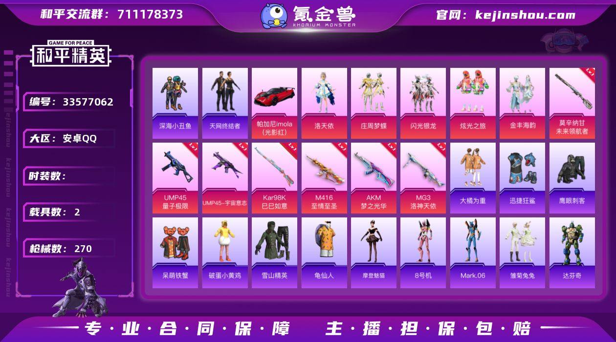 hs68327 安卓手Q-17王牌印记-1红装-6粉装-11特效枪-2载具-88450热力值-181套装-270枪皮-6卓越印记-4传奇印记 【1红装】暮色玫影-艾丽娅/2级 【6粉装】套装-庄周梦蝶,套装-炫光之旅,角色-洛天依,套装-闪光银龙,套装-金丰海韵,角色-异瞳寒姬 【11特效枪】M416-至情至圣/8级,MG3-洛神天依/4级,DP-28-豹影疾电/5级,莫辛纳甘-未来领航者/6级,Mk14-福马献瑞/3级,UMP45-宇宙意志/3级,Kar98K-巳巳如意/5级,UMP45-量子极限/5级,AKM-暮色玫影/3级,M416-灵猫魔法师/3级,AKM-梦之光华/6级 【7稀有紫装】Mark.06,8号机,天网终结者,深海小丑鱼,雪山精英,迅捷狂鲨,龟仙人 【2稀有载具】帕加尼imola(光影红),暮色幽蹄 【181稀有时装】艾丽娅/2级,洛天依,庄周梦蝶,炫光之旅,闪光银龙,异瞳寒姬,金丰海韵,龟仙人,Mark.06,雪山精英,深海小丑鱼,8号机,迅捷狂鲨,天网终结者,大橘为重,萌趣咩咩,龙魂突击队,小熊娃娃,摩登魅猫,白糯汤圆,星途旅人,冰河战士,鱼渊荷华,青团波波,燕燕于飞,达芬奇,战术大师,智谋强哥,雏菊兔兔,马上有钱,糖糖葫芦,香桃花海,蝶变,巳巳如意,湖畔霞光,曼妙人鱼,午间小调,琴音绮想,画境星梦,朱霞炽焰,美羊羊,凌霄紫焰,炫彩糖果,萌鸡速递,书海巡游,风迹短诗,秘语星愿,白光莹,冰公...