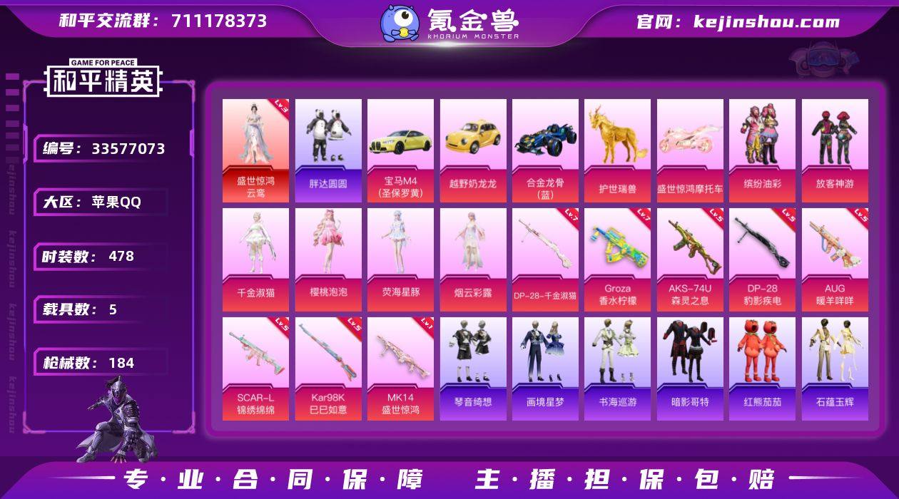 【特价出售】苹果Q-1红装5载具6粉装10特效枪13热门138套装184枪皮 70109热力值 12印记 历史无敌战神 【1红装】 盛世惊鸿-云鸾 (3级) 【5载具】 宝马M4(圣保罗黄) 越野奶龙龙 合金龙骨蓝色 护世瑞兽 盛世惊鸿摩托车 【6粉装】 千金淑猫 荧海星豚 烟云彩露 樱桃泡泡 缤纷油彩 放客神游 【10特效枪】 SCAR-L-锦绣绵绵 (5级) AKS-74U-森灵之息 (5级) Kar98K-巳巳如意 (5级) DP-28-千金淑猫 (7级) DP-28-豹影疾电 (5级) AUG-暖羊咩咩 (5级) Mk14-樱桃泡泡 (5级) Mk14-盛世惊鸿 (1级) GROZA-香水柠檬 (7级) Mk14-福马献瑞 (3级) 【13热门】 龟仙人 红熊茄茄 潮萌小黄鸭 晶辉守护 鹰眼刺客 激萌罗小黑 浪漫波比 胖达圆圆 暗影哥特 团圆交子 纯白誓言 漫步者 破蛋小黄鸡 【1背包】 神秘黑猫背包