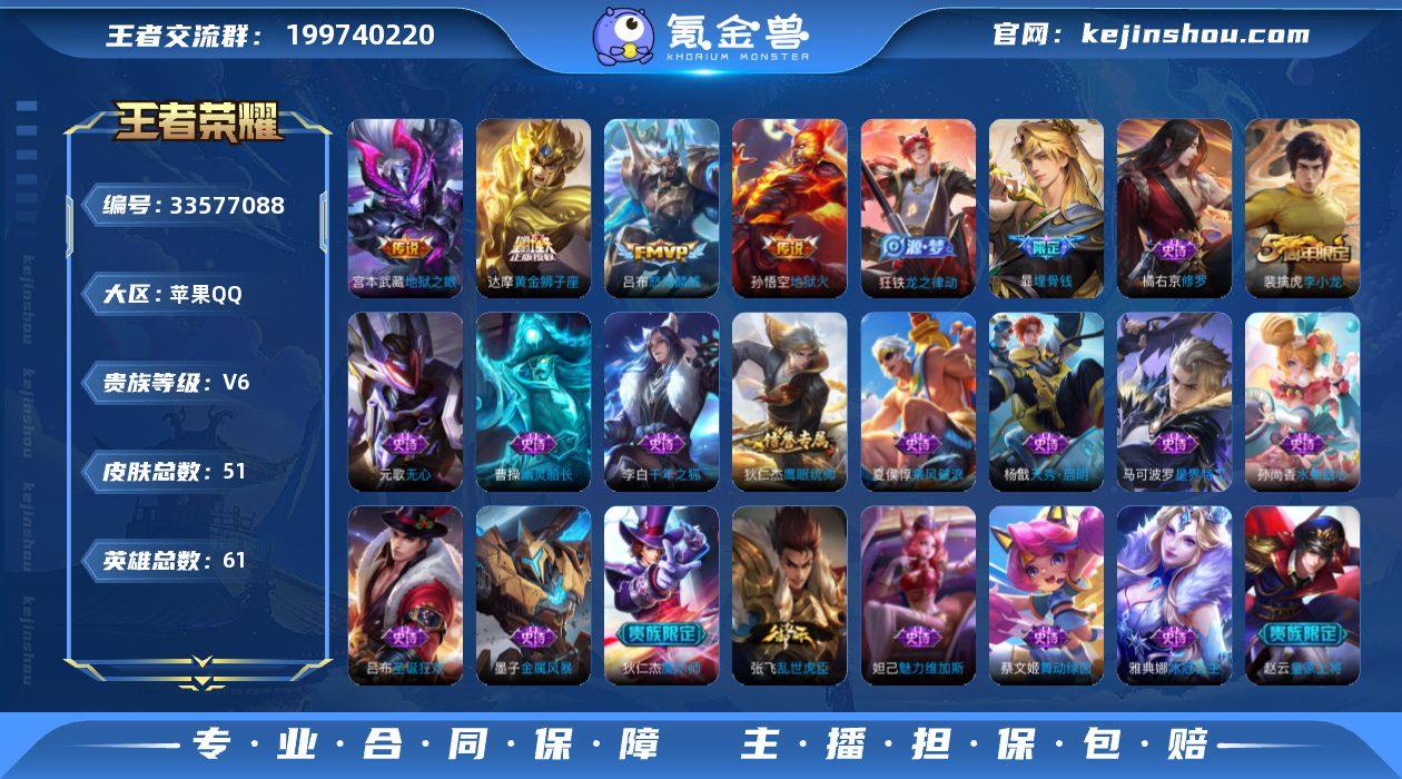 苹果QQ/至圣王者/51皮肤/61英雄/0典藏/0珍品无双/1无双/1珍品传说/6传说/23史诗/6稀有英雄 【1 珍品传说】沧流箭 伽罗, 【1 无双皮肤】无相 孙悟空, 【6 传说皮肤】地狱火 孙悟空,神骥·逐星野 马超,地狱之眼 宫本武藏,神骥·越千峰 云缨,怒海麟威 吕布,黄金狮子座 达摩, 【23 史诗皮肤】天秀·启明 杨戬,无心 元歌,线条小狗 周瑜,修罗 橘右京,魅力维加斯 妲己,舞动绿茵 蔡文姬,鹰眼统帅 狄仁杰,李小龙 裴擒虎,光弋星穹 莱西奥,金属风暴 墨子,魔术师 狄仁杰,埋骨钱 暃,龙之律动 狂铁,皇家上将 赵云,冰冠公主 雅典娜,圣诞狂欢 吕布,千年之狐 李白,乱世虎臣 张飞,星界特工 马可波罗,线条小狗 小乔,水果甜心 孙尚香,幽灵船长 曹操,乘风破浪 夏侯惇, 【18 勇者皮肤】纽约教父 刘备,丁香结 小乔,汉昭烈帝 刘备,阴阳师 狄仁杰,径山谋武 孙权,海滩派对 项羽,百相守梦 影,死亡骑士 亚瑟,逐霄之志 曹操,溯影追猎 虞姬,极光幻客 蚩奼,往忆晖光 明世隐,荣光之誓 亚瑟,万象初新 宫本武藏,街头霸王 韩信,幻想奇妙夜 王昭君,鹤鸣心笺 艾琳,线条小狗 周瑜, 【4 其他皮肤】沧流箭 伽罗,碧珀绯影 暃,启蛰 司空震,天启骑士 关羽, 【6 稀有英雄】不知火舞,橘右京,娜可露露,韩信,艾琳,赵云, 营地ID: